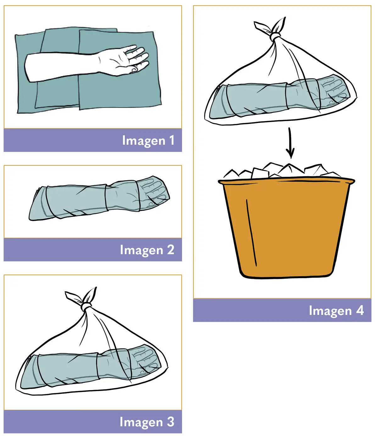 4. Ponemos esta bolsa en un recipiente (coca, olla, balde o bolsa) que contenga hielo con arroz (sin cocinar), o musgo o agua muy fría, para mantener la parte del cuerpo a baja temperatura; verificamos que el hielo no pegue directamente contra la zona amputada para evitar que la queme el frío. Cuidemos que aquello que pongamos en el segundo recipiente no entre en contacto con el interior de la bolsa que contiene la parte amputada (que no se humedezca). (Imagen 4)