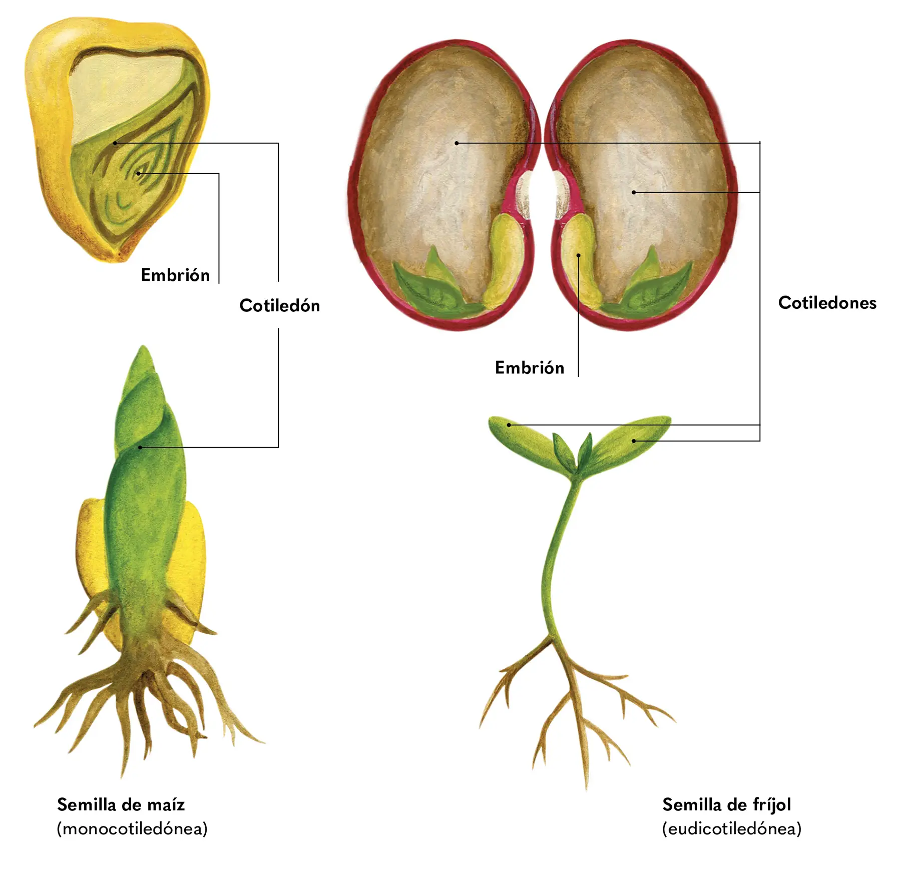 La razón por la cual a este grupo de plantas se le conoce como monocotiledóneas es porque la semilla solo tiene un cotiledón, que es lo primero que vemos cuando una planta germina. Es una hoja especial que sirve como reserva de alimento para la semilla mientras germina y la pequeña planta desarrolla sus hojas. Las monocotiledóneas son al menos 74 000 especies y comprenden pastos, orquídeas, palmas, cereales, guaduas, bambúes, lirios y plátanos, entre muchas otras.