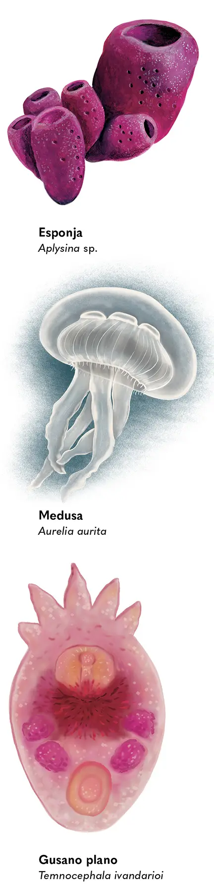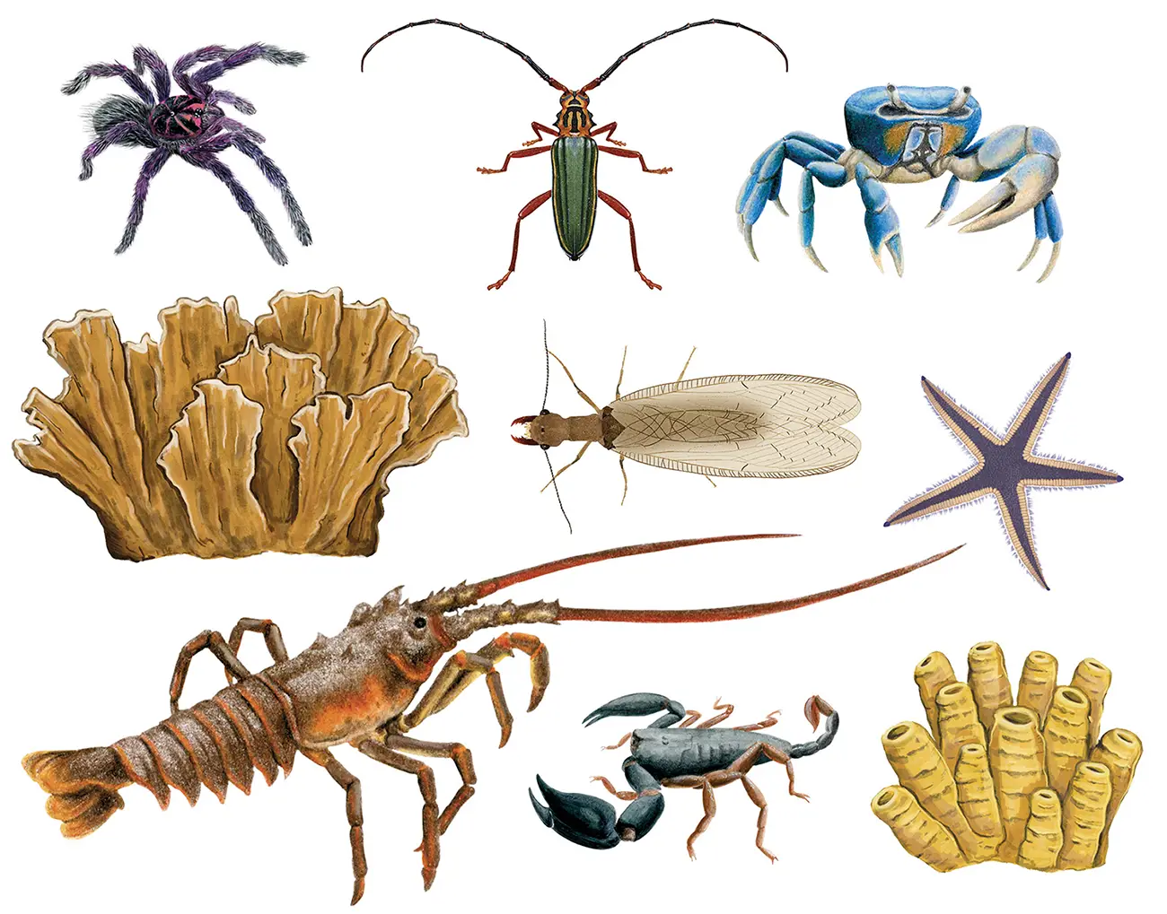Los animales sin vértebras son: esponjas (poríferos); medusas, corales y anémonas (cnidarios); gusanos planos (platelmintos); gusanos redondos (nemátodos); pulpos, calamares, babosas y caracoles (moluscos); lombrices y sanguijuelas (anélidos), erizos y estrellas de mar (equinodermos); cangrejos, langostas, camarones, arañas, escorpiones, ácaros, garrapatas, ciempiés, milpies, colémbolos e insectos (artrópodos).