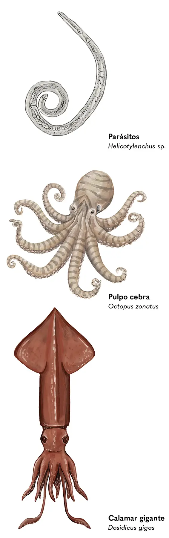Estos animales reciben el nombre de cefalópodos, que significa “pies en la cabeza”, y el grupo lo conforman más de 800 especies, todas marinas. Los cefalópodos tienen un sofisticado sistema nervioso, son ágiles y muy inteligentes. Pueden cambiar de color según su estado de ánimo o para camuflarse en su entorno. Se clasifican según el número de tentáculos o brazos con ventosas que poseen: los calamares tienen diez, ocho para nadar y dos para sujetar a sus presas, mientras que los pulpos tienen ocho.