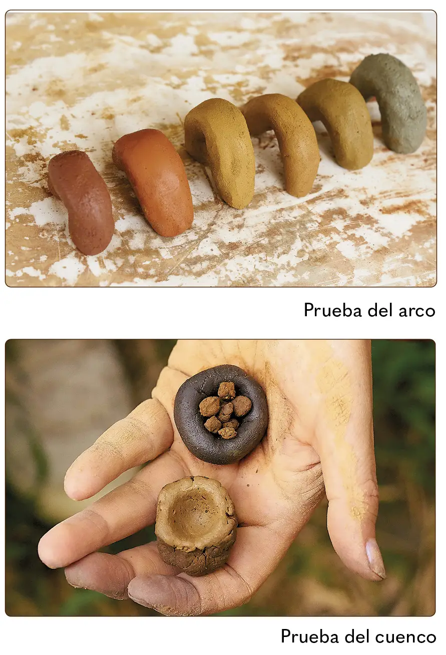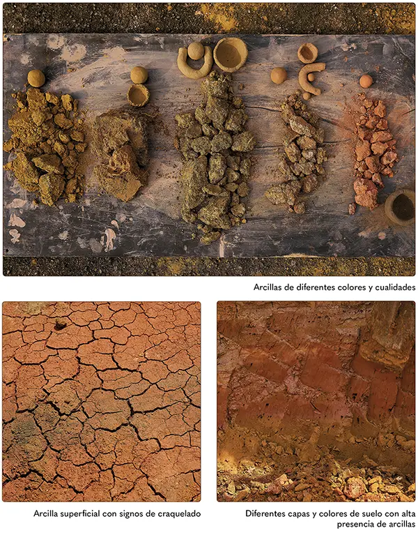 Además, podemos buscarlas haciendo un hueco en la tierra, casi que en cualquier lugar. Generalmente, en la parte más cercana a la superficie encontramos una capa negra, que llamamos humus o tierra de capote. Está constituida por materia vegetal descompuesta o en descomposición. Si tomamos un puñado de esta tierra negra en la mano y le echamos un poco de agua, se deshace. Más abajo de la tierra de capote casi siempre cambia el color de la tierra hacia tonos más claros (generalmente amarillos y rojizos). Para saber si en esta capa la tierra tiene un buen contenido de arcilla, le echamos un poco de agua y la apretamos con las manos: si se deshace, probablemente contiene mucha arena o materia orgánica; si, por el contrario, tiene una textura jabonosa o grasosa, es elástica y se deja moldear, nos encontramos en presencia de arcillas aptas para convertirlas en piezas de cerámica.