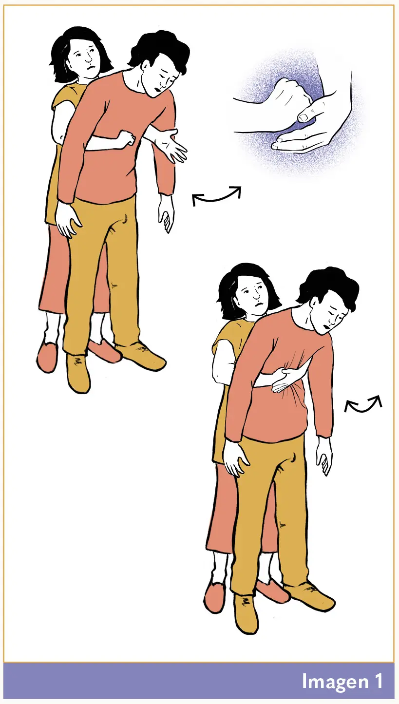 4. Hacemos compresiones abdominales en dirección adentro y arriba, tirando el paciente hacia nosotros, como si lo fuéramos a levantar, hasta que el cuerpo extraño salga o se mueva. (Imagen 1)
