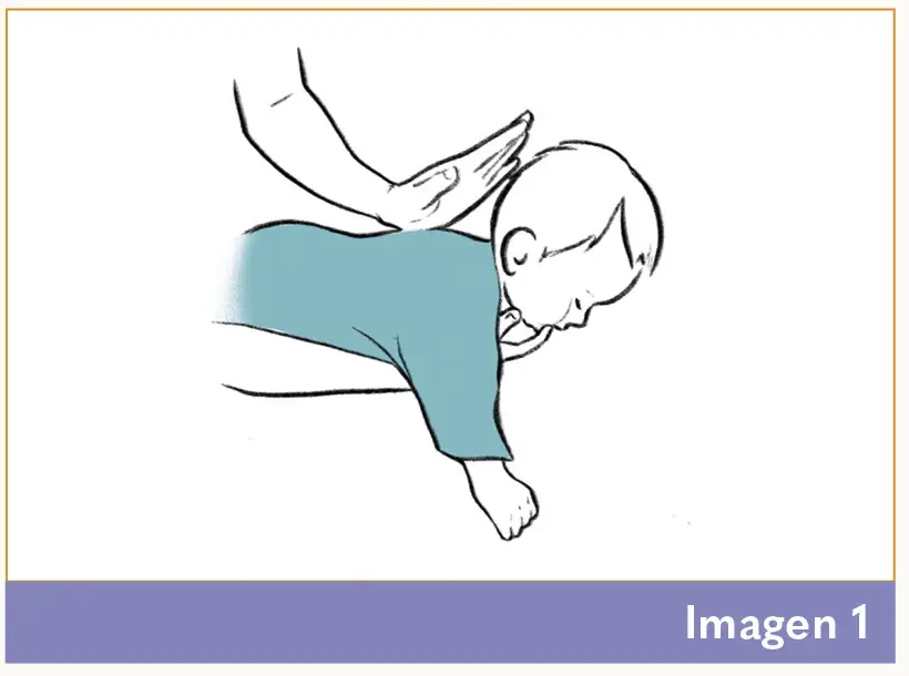 · Damos golpes en la espalda del bebé entre los dos omoplatos (entre las paletas) hasta que el cuerpo extraño haya salido o el bebé empiece a llorar. (Imagen 1)