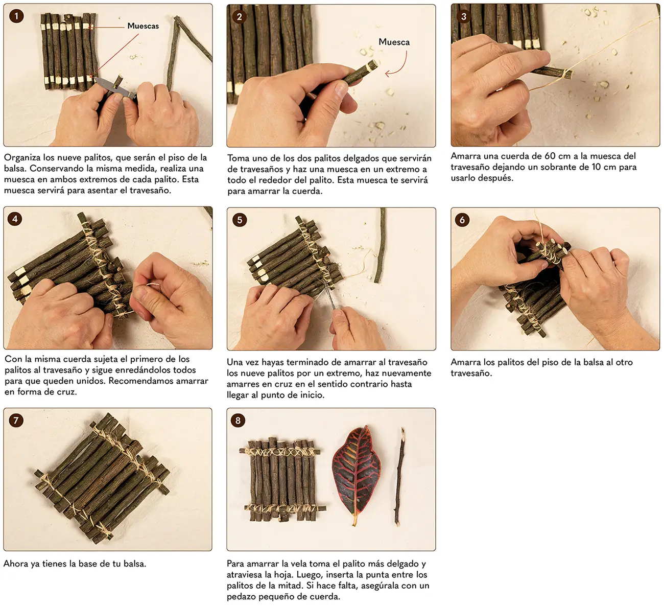 Con esta balsa podrás navegar con la imaginación y tal vez hacer de uno de tus juguetes un gran marinero. Necesitarás una navaja, así que pide ayuda a un adulto. También debes buscar algunas ramitas de madera más o menos derechas.