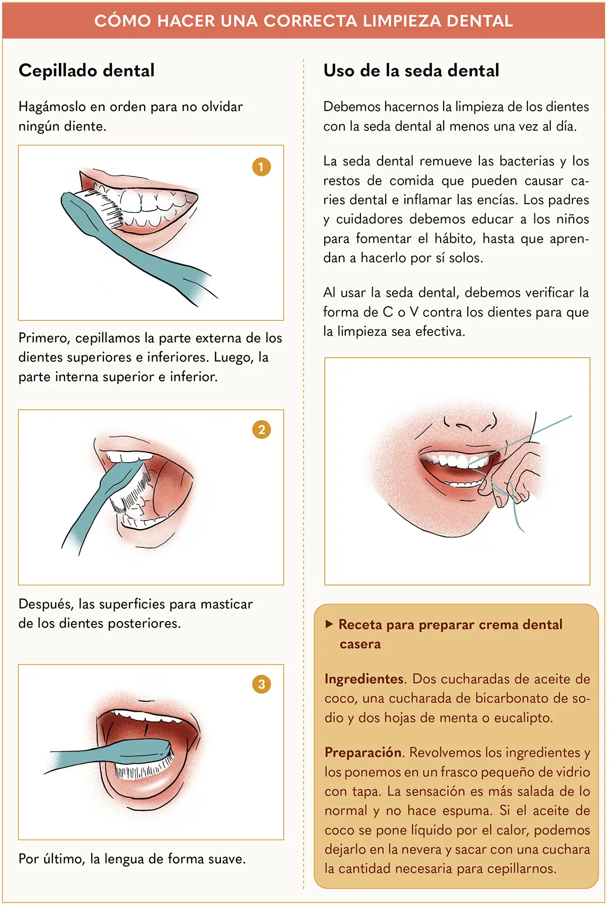 · Cepillarnos los dientes correctamente después de cada comida con cepillo y crema dental con flúor, y utilizar un cepillo del tamaño adecuado para la boca.