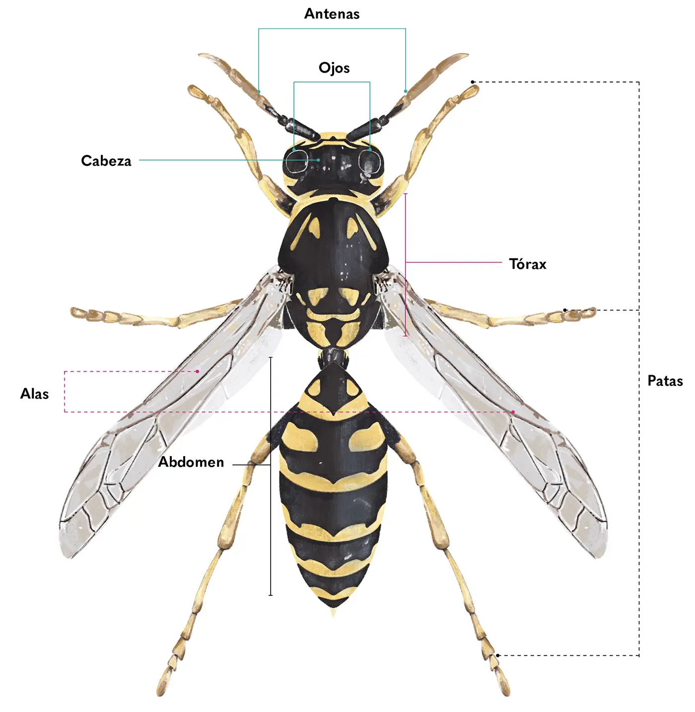 Los insectos se caracterizan por tener tres pares de patas, un par de antenas y un cuerpo dividido en cabeza, tórax y abdomen. La mayoría tiene dos pares de alas. Cuentan con un sistema digestivo completo que les permite asimilar nutrientes y expulsar los desechos, y con un sistema circulatorio abierto, en el que pequeños corazones bombean un líquido que transporta los nutrientes por todo su cuerpo, así como lo hace la sangre de los vertebrados. A diferencia de estos, el oxígeno no se transporta por este mismo sistema, sino por una red de pequeños tubos conocida como sistema respiratorio traqueal. Para moverse y responder a lo que pasa a su alrededor, los insectos tienen un sistema nervioso especial dividido en ganglios que controlan las partes de su cuerpo.