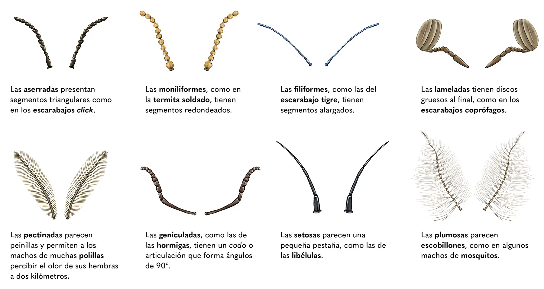 Los insectos tienen un par de antenas en la cabeza que les sirven para tocar, oler y detectar humedad y temperatura. Estas varían en forma y tamaño.