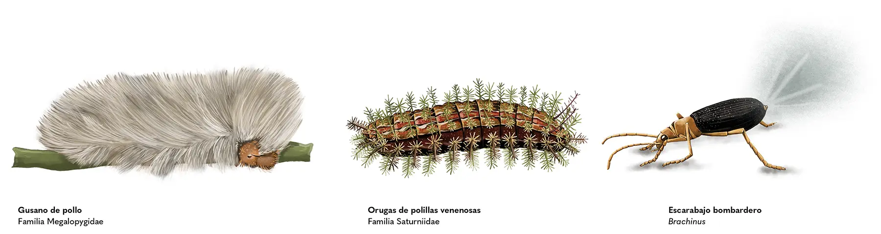 Por otro lado, hay insectos que se toman la defensa como una oportunidad de ataque. Las orugas de algunas polillas pueden dar un toque ofensivo con sus espinas o pelos urticantes a quien las toque, y causar una irritación severa, incluso un envenenamiento grave. Otras orugas tienen fluidos corporales con sabores que provocan que sus depredadores las desechen.