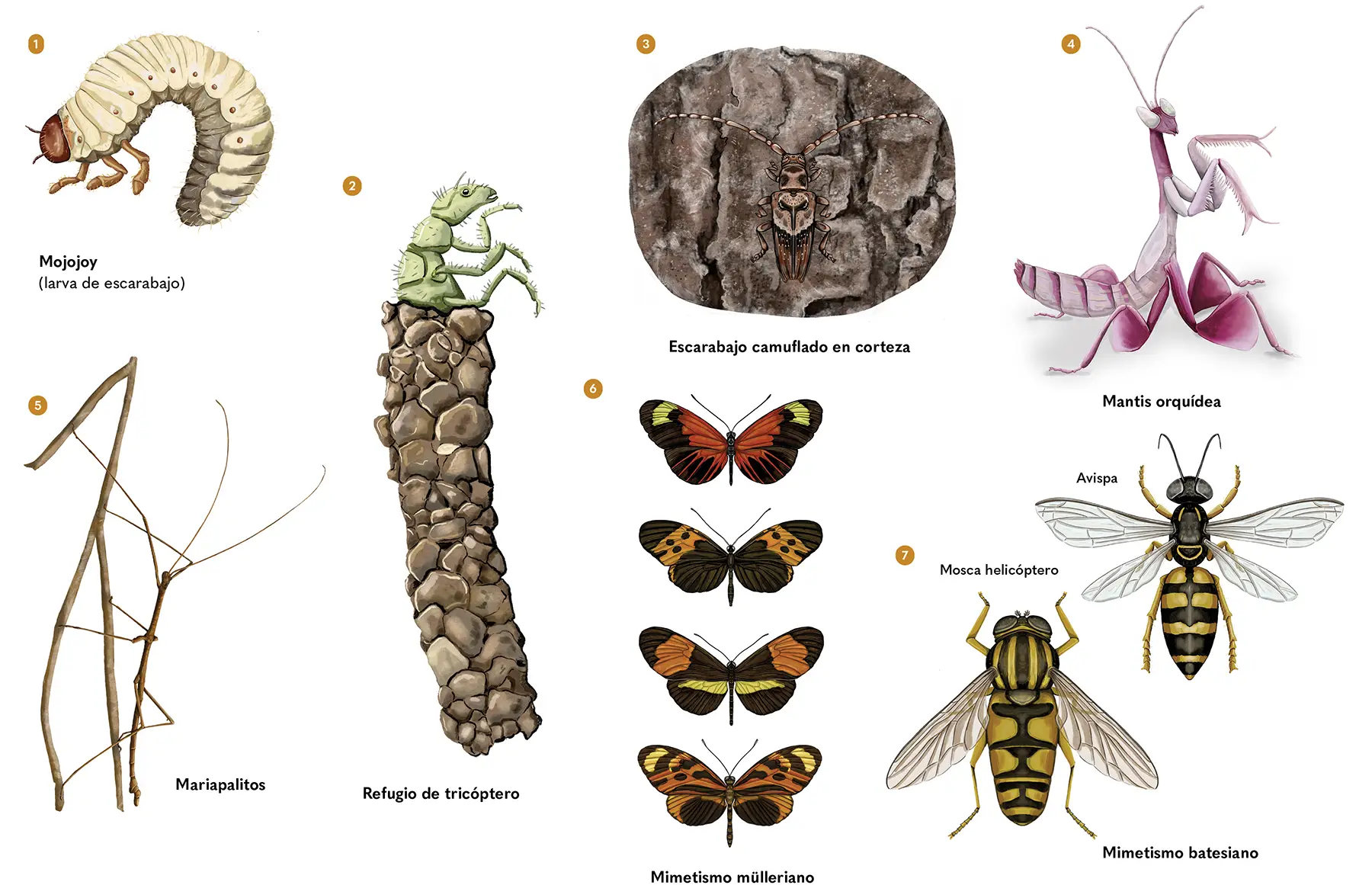 A la hora de camuflarse, ningún grupo animal muestra tantas estrategias como los insectos. Presentan colores que los camuflan con las superficies de cortezas (3), hojarasca o suelo, como en los escarabajos de antenas largas. Mantis religiosas (4) y mariapalitos (5) tienen estrategias en las que todo su cuerpo luce como flores, hojas y pequeños tallos de una planta.