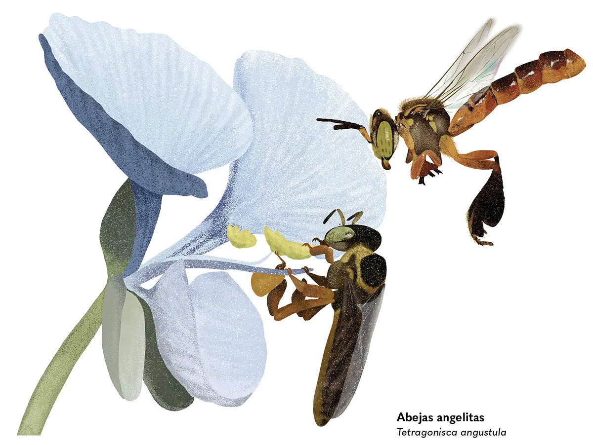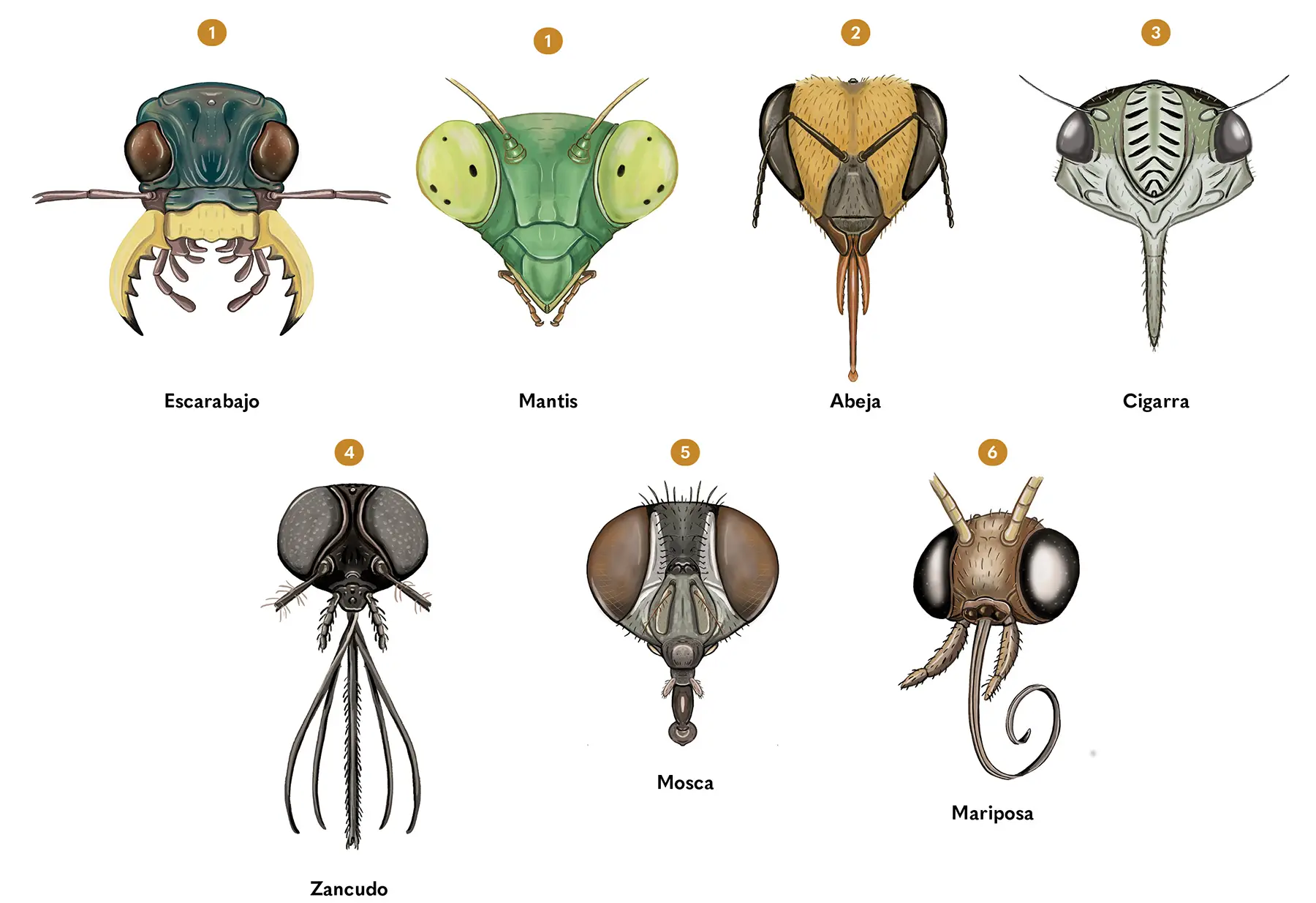 Los aparatos bucales de los insectos nos cuentan cómo y de qué se alimentan. Cuando el alimento es sólido, aquellos son de tipo masticador, con mandíbulas a cada lado de la cabeza para pellizcar y cortar el alimento (1), como en los grillos, las mantis religiosas, las avispas y los escarabajos. Algunos como las abejas tienen, además, una lengua para consumir líquidos (2). Los insectos chupadores se alimentan de líquidos y tienen las piezas bucales transformadas para sorber o chupar. En el caso de las cigarras (3) y los zancudos (4), las partes bucales les sirven para perforar y succionar el alimento. La mayoría de las moscas, en cambio, chupan sustancias líquidas sin perforar las superficies (5), y las mariposas chupan a través de un largo canal, la espiritrompa, que enrollan y extienden para alimentarse (6).