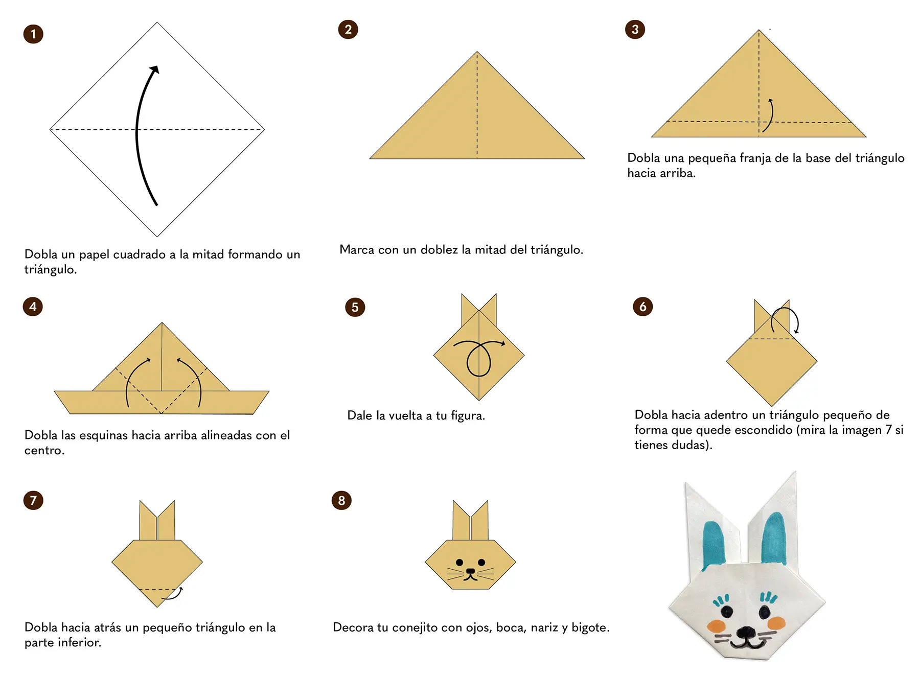 El origami, o papiroflexia, es un arte antiguo japonés que consiste en doblar papeles de diferentes maneras para crear figuras. Te recomendamos hacerlo con el papel más delgado que tengas disponible, para que sea más fácil doblarlo. Puedes agregar detalles de los distintos animales, como orejas, narices y ojos, usando colores, marcadores, lápiz o lapicero.