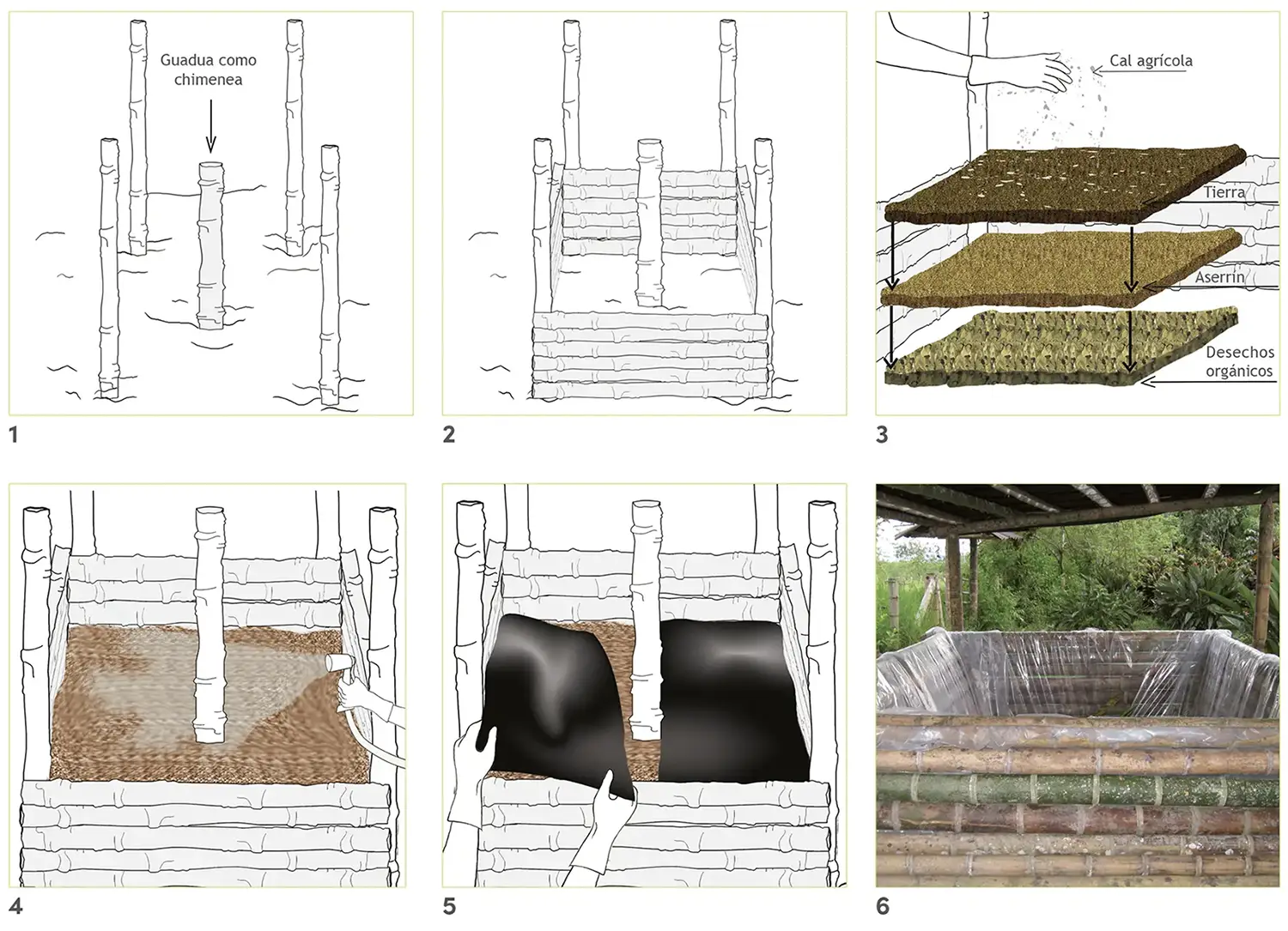 La compostera sirve para transformar en abono los residuos de origen vegetal crudos y cáscaras de huevo. Es un espacio semejante a un corral de guadua, aunque también se puede hacer con bloques de ladrillo o malla metálica de gallinero.