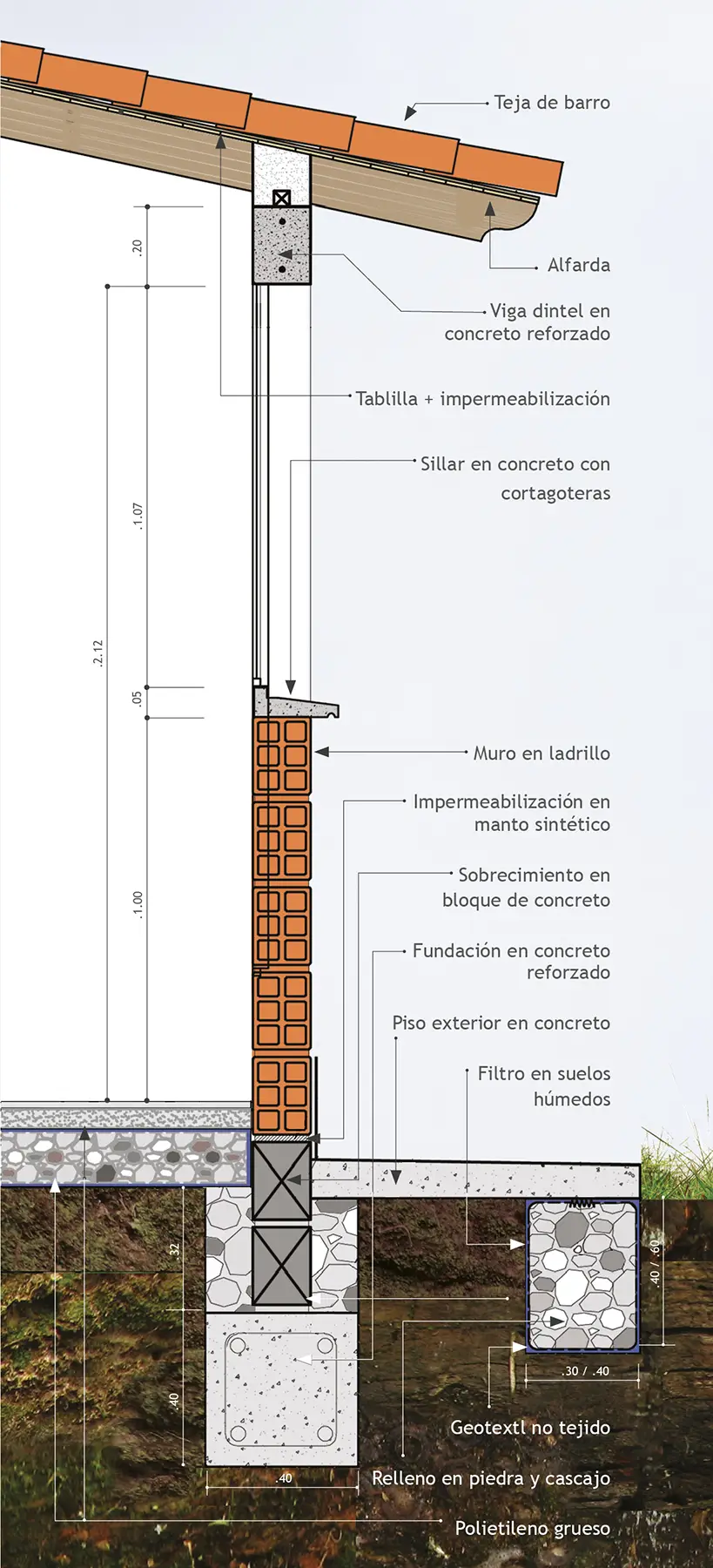 Sobre las fundaciones se pegan una o dos hiladas de bloque de concreto de buena calidad, sobre los cuales se coloca un manto impermeable, ubicado entre el piso interior y la superficie exterior.