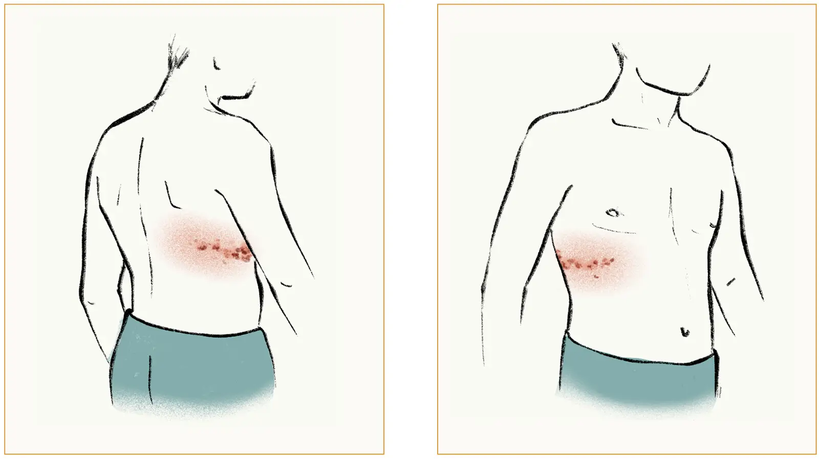 Desde antes de salir la erupción, sentiremos una sensación rara en la zona, que puede ir desde dolor hasta cosquilleo. También puede ir acompañado de malestar general. Cuando aparece el sarpullido, vemos unas bombitas rojas que arden mucho. Después de una semana aproximadamente, esta erupción se seca sola.
