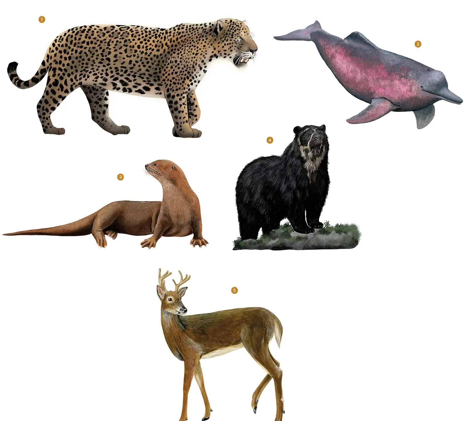 La nutria o lobito de río (Lontra longicaudis) (3) es un mamífero acuático ágil y juguetón que habita en ríos y lagos de América del Sur. Su cuerpo alargado, patas palmeadas y pelaje impermeable le sirven para nadar y cazar bajo el agua sus alimentos favoritos: apetitosos peces y crujientes crustáceos.