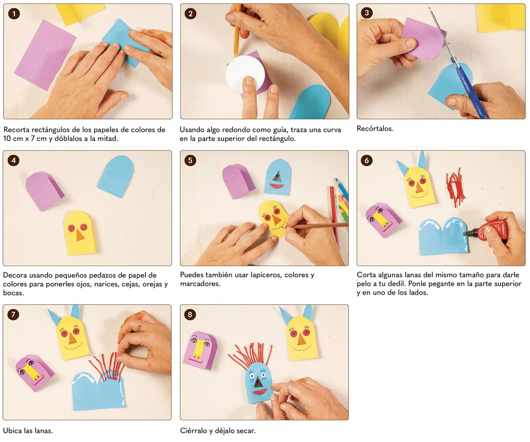 Los dediles pueden funcionar como títeres. Son muy divertidos y tienen varias ventajas, entre ellas, que puedes ponerte varios en una misma mano, que son muy fáciles de hacer y que puedes usar diferentes materiales y combinar técnicas (papeles de colores, pintura, marcadores y lápices de colores).