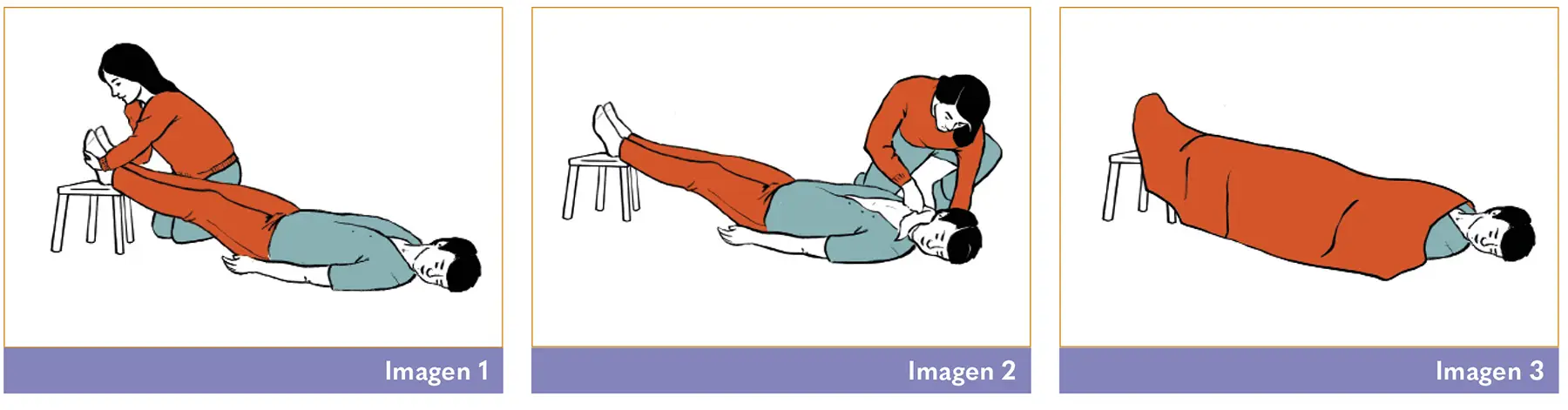 1. Acostamos a la persona con la cabeza hacia un lado y las piernas elevadas 30 centímetros. (Imagen 1)