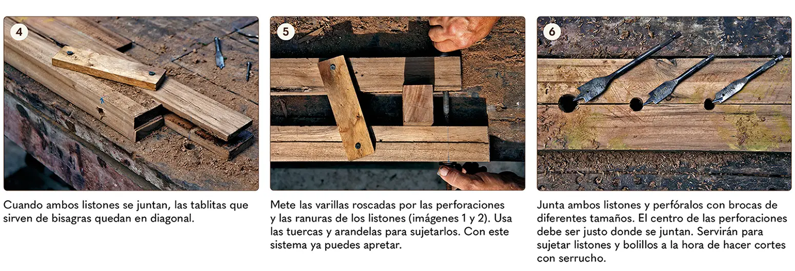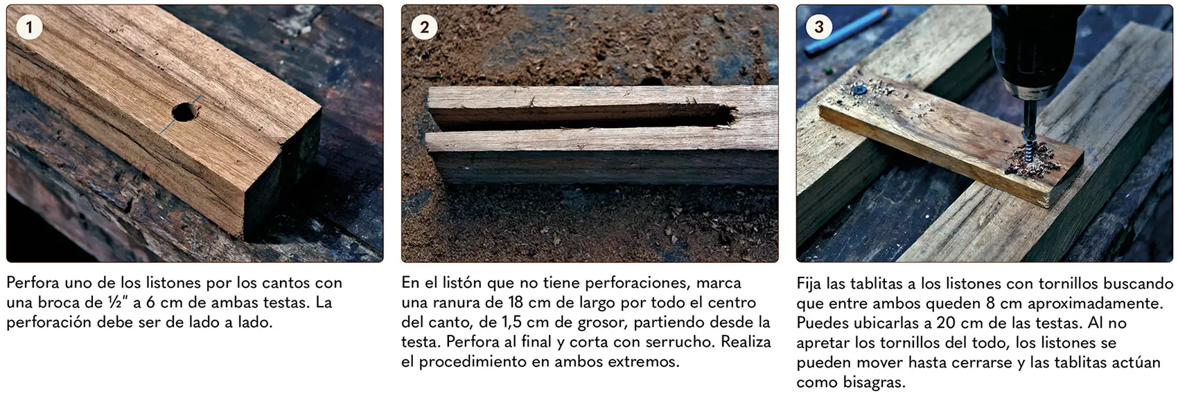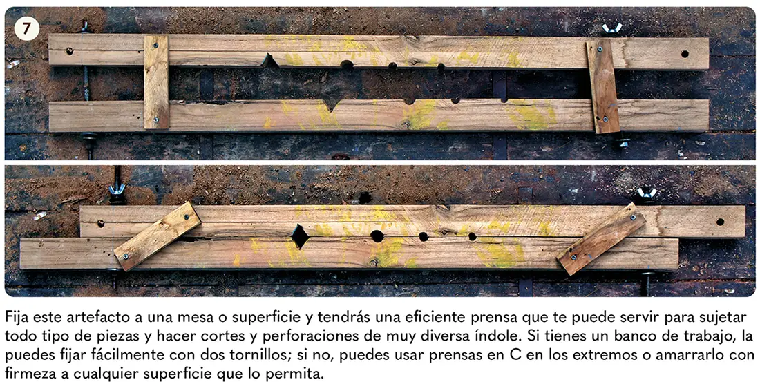 Para elaborar los objetos que aparecen en este libro hay que cortar la madera a la medida precisa y llevar a cabo diferentes procesos. Con el ánimo de facilitar unos y otros, daremos a continuación un paso a paso de cómo construir una prensa usando dos listones o maderos grandes que nos serán útiles para sujetar las piezas y cortarlas fácilmente; esta prensa, además, nos servirá como guía para que el serrucho corte derecho (para evitar torcernos y hacer cortes disparejos).