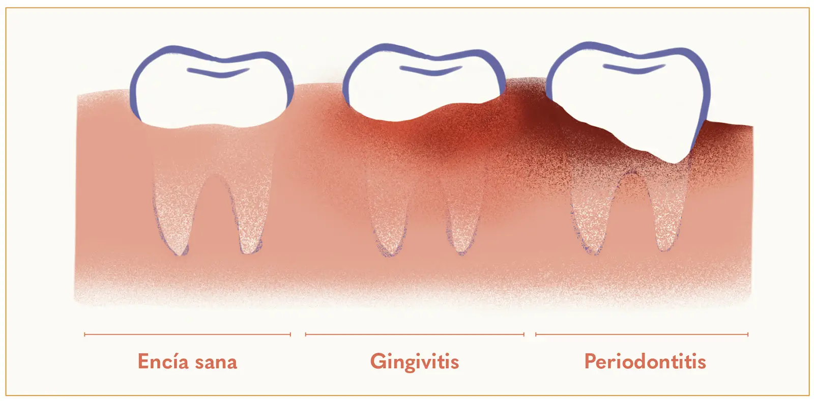 Si no removemos diariamente la placa bacteriana, esta se endurecerá y formará cálculos alrededor del diente, lo que afecta la salud del hueso, los tejidos que lo sostienen y las propias encías. Además, la gingivitis puede tener consecuencias graves, porque al dañarse el soporte de los dientes, estos quedan en riesgo de caerse. Es una enfermedad silenciosa y uno de sus síntomas es el mal aliento, además de que los dientes empiezan a parecer alargados por la pérdida de tejidos de sostén, como el hueso y la encía.