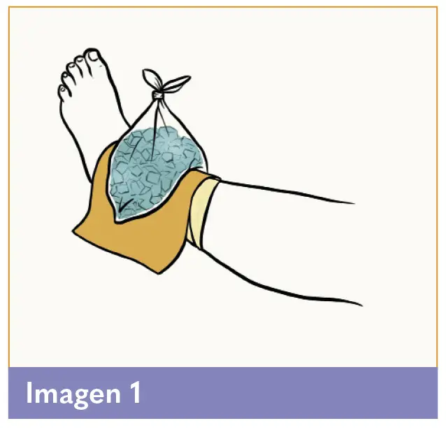 Podemos utilizar agua muy fría, hielo o elementos del congelador para aplicar sobre el área de la torcedura. Antes de hacerlo, cubrimos la piel con una tela para evitar que el frío la queme (Imagen 1). Utilicemos esta técnica el mismo día de la lesión durante el tiempo que el paciente la tolere y repitamos varias veces al día. Durante los siguientes días, podemos aplicar paños de agua tibia y repetir el procedimiento cuantas veces sea necesario.