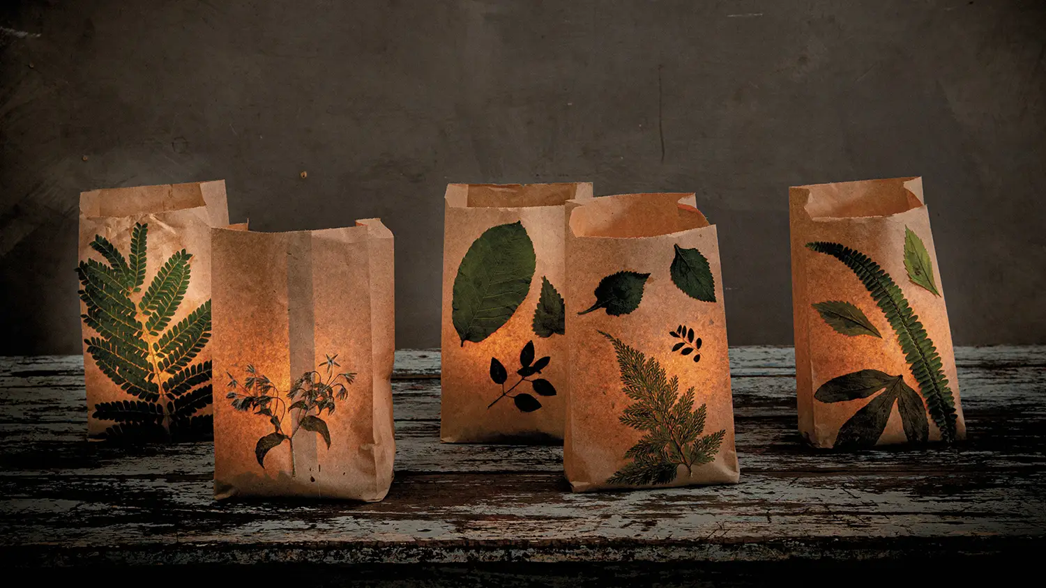 Estos farolitos alumbrarán con gracia el camino de noche. Solo necesitas buscar tus hojas preferidas y prensarlas metidas entre un libro por algunos días para que se aplanen y peguen más fácilmente. Luego, las pegas con mucho cuidado en bolsitas de papel. Para que se sostengan puedes echarles arena adentro, que también servirá para mantener las velas paradas y evitar que se quemen las paredes. Son perfectas para el Día de las Velitas, o simplemente para ambientar alguna ocasión especial y darle un aire agradable a una velada.