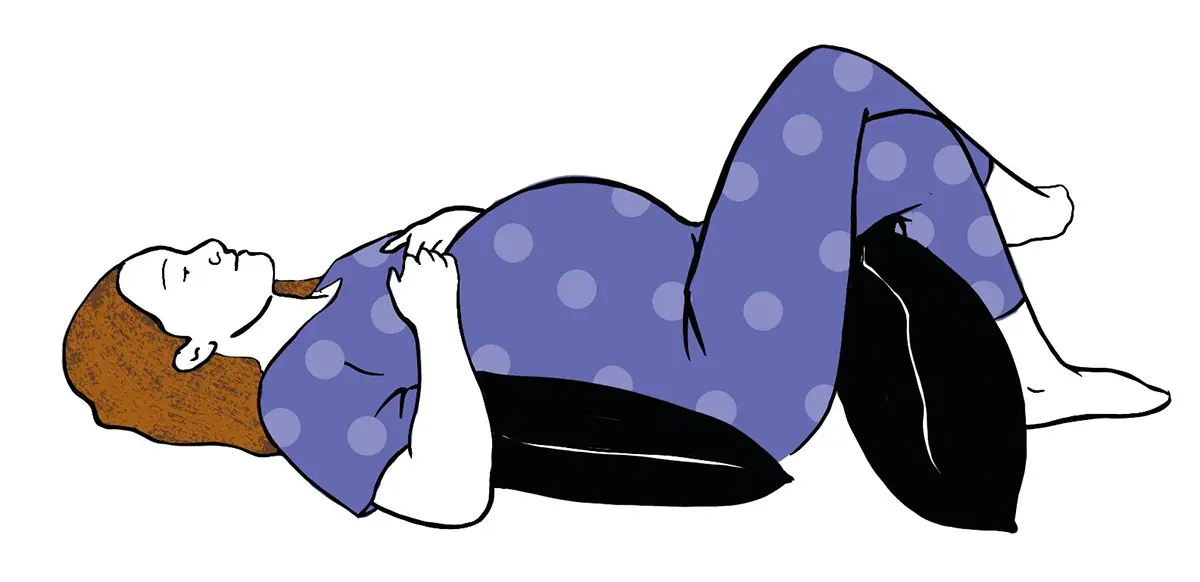 En caso de sangrado vaginal en mujer embarazada, usemos una manta o toalla entre las piernas, y pidámosle que las cruce y las levante un poco, con una almohada bajo el pliegue de las rodillas.
