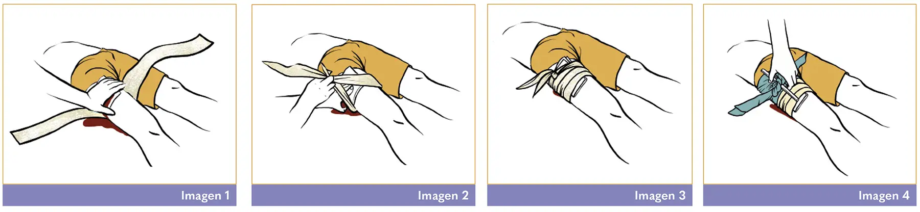 3. Si el sangrado no se detiene y los apósitos se manchan de sangre, debemos hacer un torniquete. (Ver imagen 4)