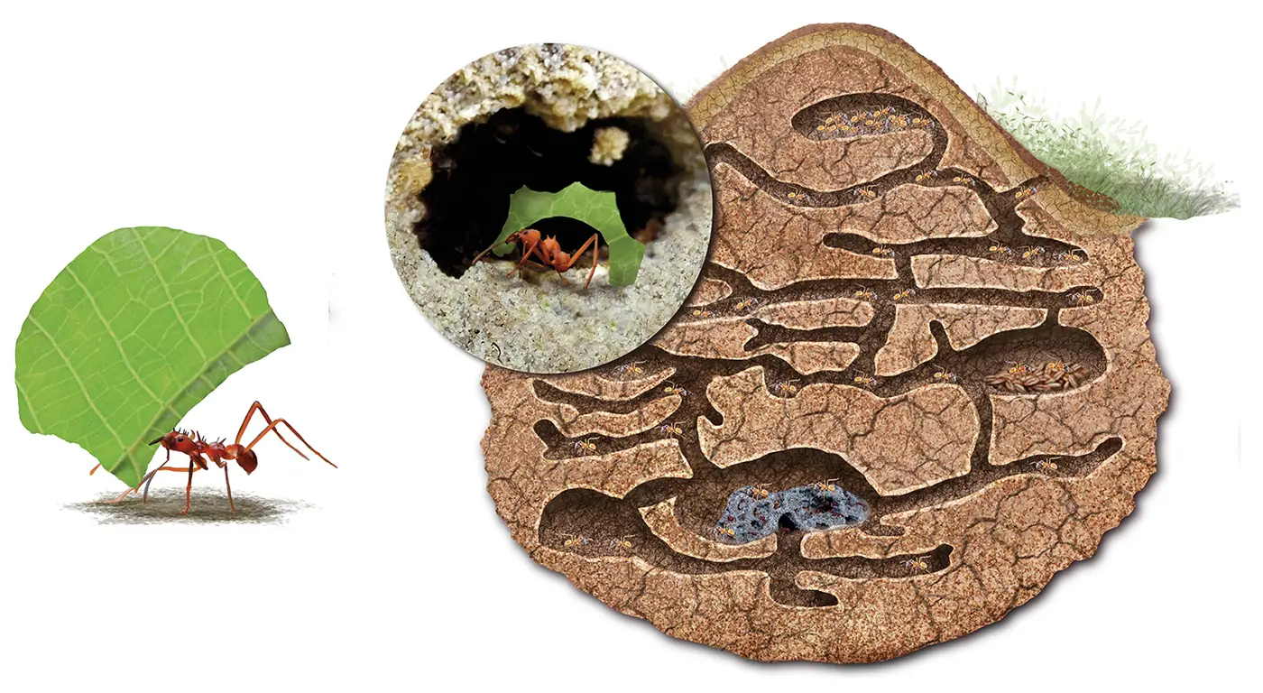 Las hojas que vemos a las hormigas cargar por largos caminos van directamente hacia el hormiguero, donde tienen un inmenso cultivo de hongos agaromicetos principalmente. Las hormigas cuidan delicadamente su cultivo de hongos y se aseguran de que esté limpio y libre de enfermedades, retiran malezas y aplican antibióticos naturales contra bacterias.