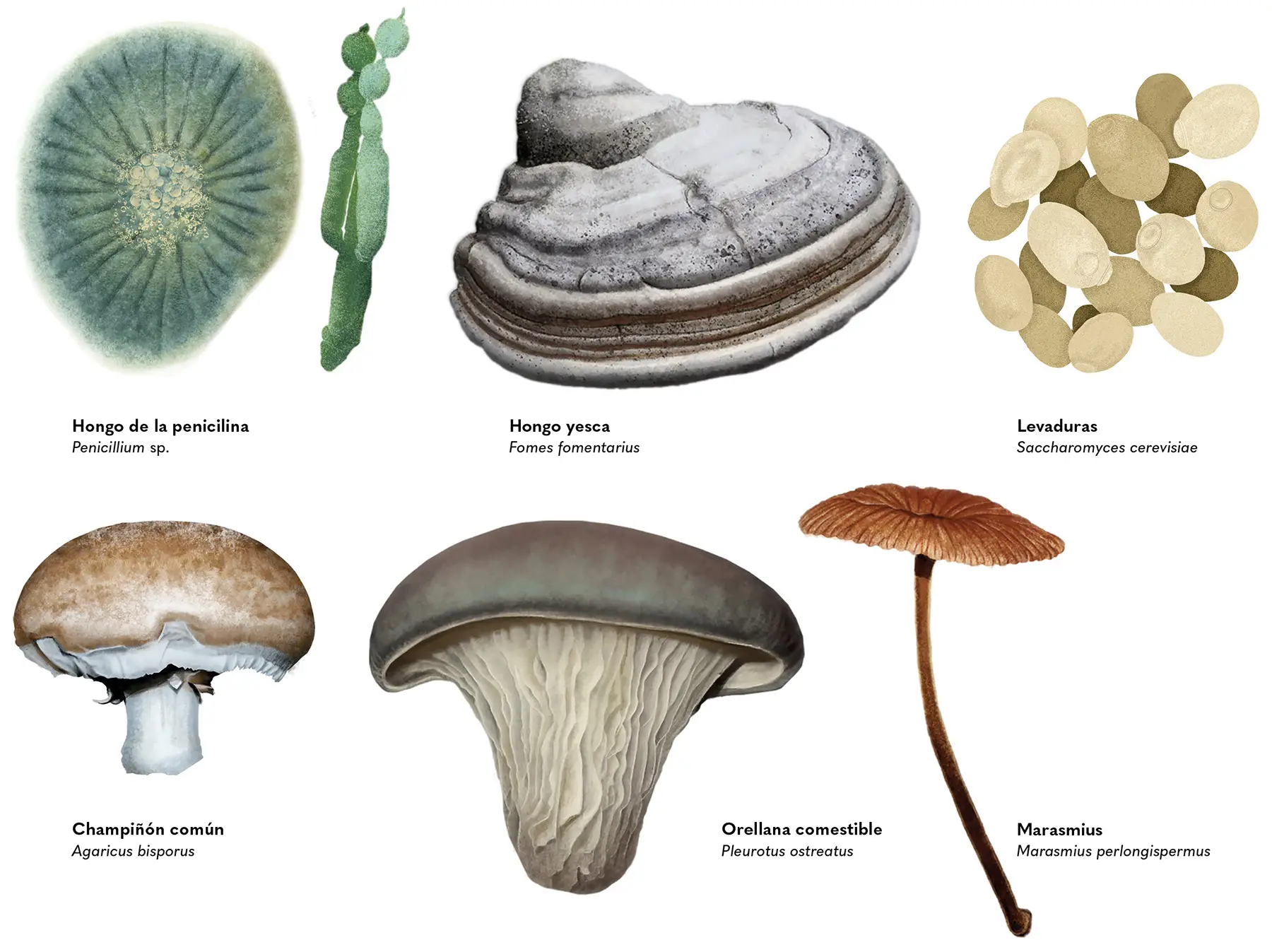 Desde tiempos muy remotos, los humanos hemos descubierto propiedades terapéuticas en diferentes especies de hongos. Por ejemplo, Hipócrates (el padre de la medicina moderna) utilizaba el hongo leñoso Fomes fomentarius para cauterizar heridas. Más recientemente, en el año 1928, el científico Alexander Fleming descubrió uno de los antibióticos más conocidos e importantes para la humanidad: la penicilina, producida por especies del hongo Penicillium. Existen más de 1000 especies comestibles de hongos. Algunas, como las orellanas y los famosos champiñones, tienen mayores contenidos de proteína que la carne, además de vitaminas y fibras.