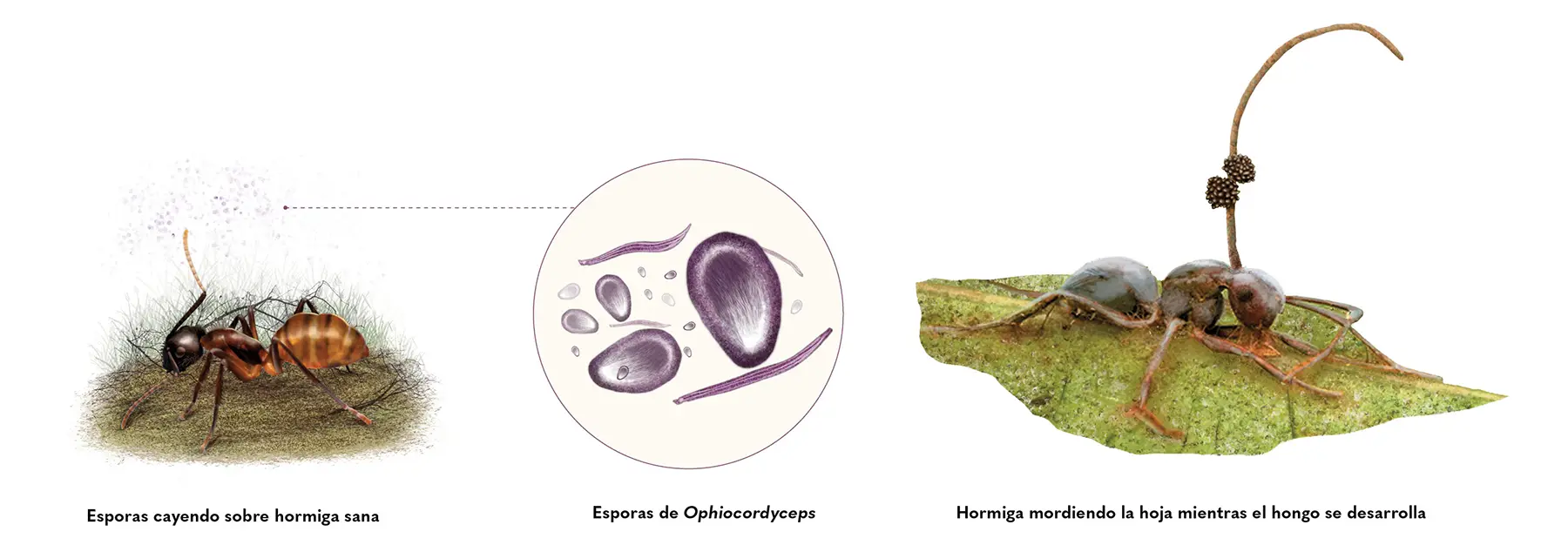 Los hongos Ophiocordyceps son invasores especiales que pueden vivir dentro de otros animales, como las hormigas carpinteras. El ciclo comienza cuando una espora del hongo se posa en la cabeza de una hormiga y germina, colonizando así sus tejidos internos. El hongo libera sustancias que afectan el comportamiento de la hormiga y la hacen mover de manera extraña, por lo que aquellas son llamadas hormigas zombis. Después de dos o tres semanas, la hormiga deja su nido, sube a una planta, muerde una hoja y se queda aferrada a ella hasta morir. El hongo consume sus entrañas y produce algo similar a un tallo que crece desde la articulación de su cabeza. Este libera esporas que caen sobre otras hormigas, y así se reinicia el ciclo sombrío.