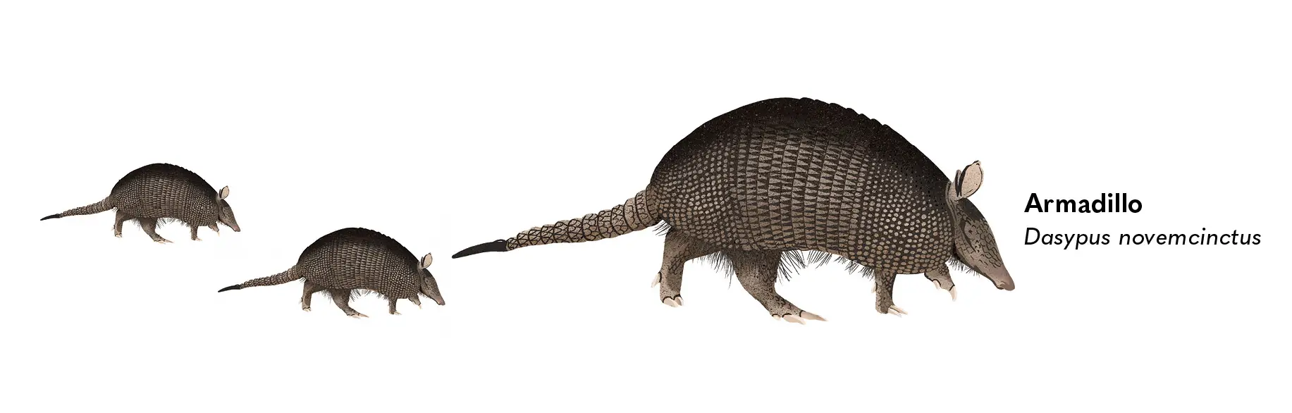Una característica especial de los armadillos es su coraza de hueso recubierto de queratina. Esta protección es rara en mamíferos y se encuentra solamente en los 21 tipos de armadillos, pero es común en reptiles como cocodrilos y algunos dinosaurios. Los armadillos, hormigueros y perezosos son parte del mismo grupo, llamado Xenarthra , que está relacionado con elefantes y manatíes.
