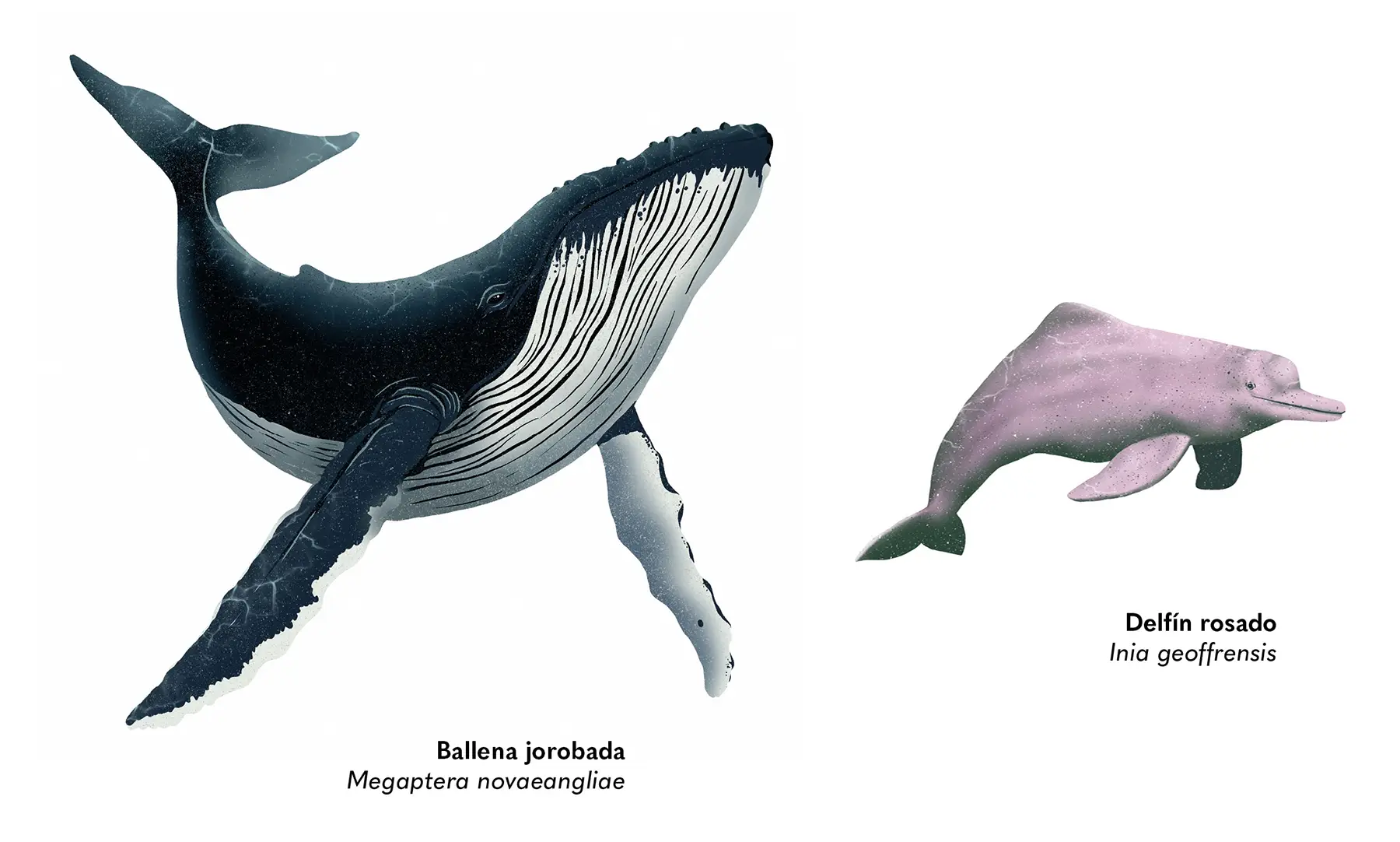 Imagina poder sostener la respiración por casi dos horas bajo el agua, no comer por seis meses y ser el mayor gigante que ha habitado el planeta. Estas son algunas características de las ballenas, mamíferos adaptados a vivir en el agua. Con 82 especies conocidas, están emparentadas con animales como hipopótamos, cerdos, vacas y venados. Hay dos tipos de cetáceos: los que tienen dientes (como orcas y delfines) y los que tienen barbas (como la ballena jorobada). La ballena jorobada encuentra su alimento en las aguas frías de los polos; sin embargo, debe migrar hacia aguas cálidas, como las del Chocó, en Colombia, para dar a luz a sus crías. Las ballenas son otro gran ejemplo de cómo los mamíferos placentados han sido capaces de conquistar casi todos los lugares del planeta.