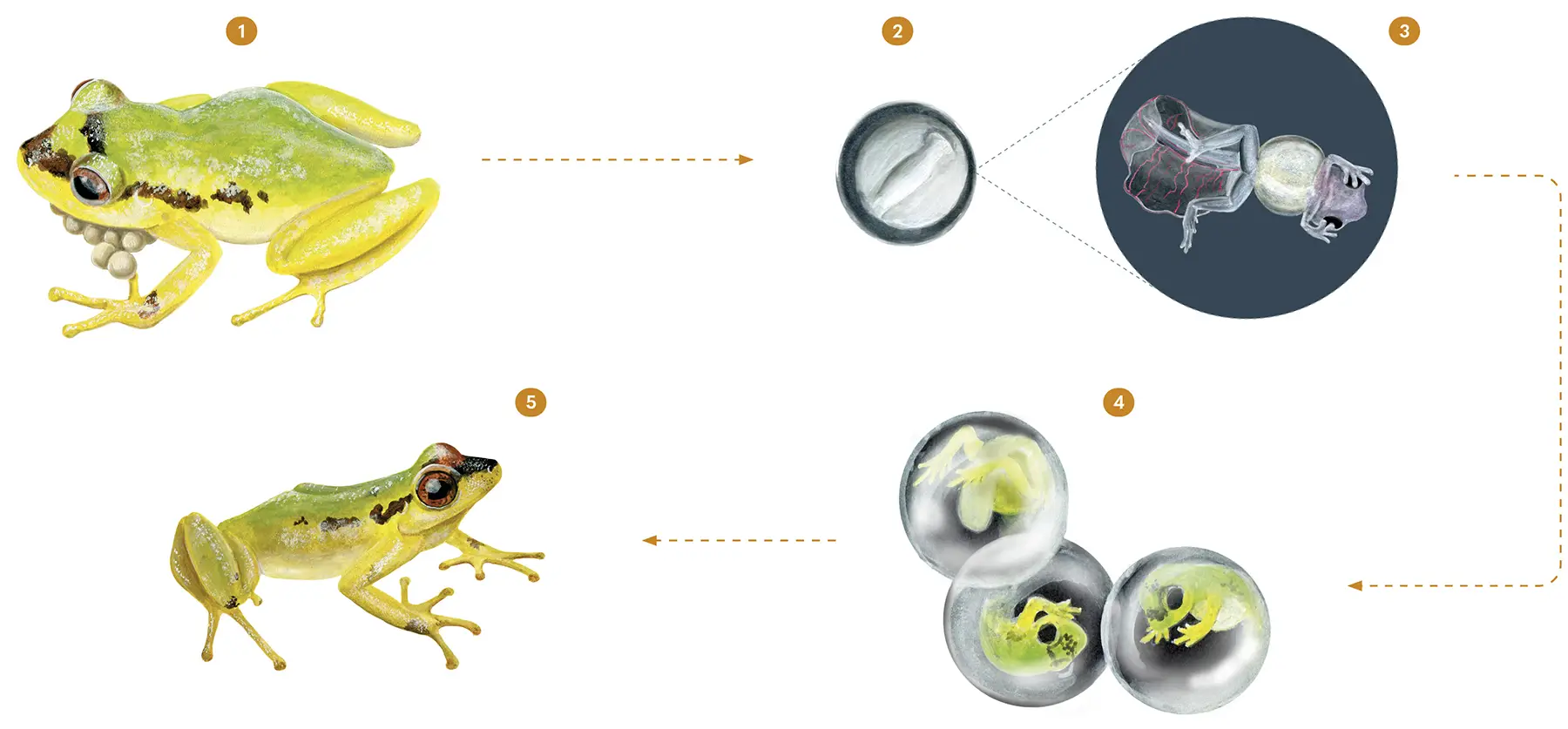 Sin embargo, algunos anfibios, como las ranas de lluvia, tienen un desarrollo directo y no pasan por la etapa de renacuajos: nacen ya con las características de un adulto, solo que en miniatura.