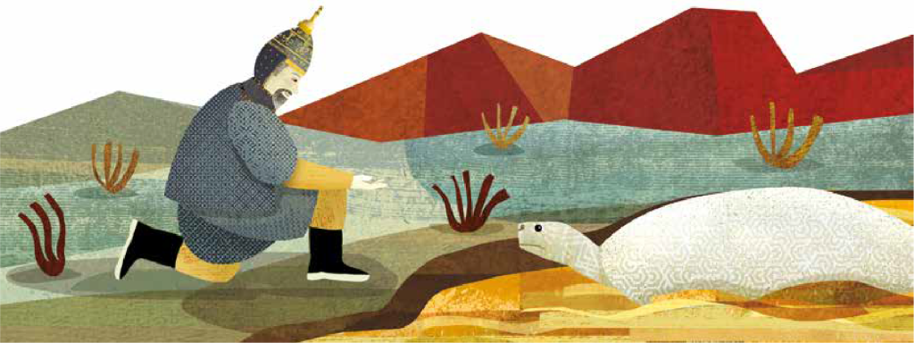 Los hombres del general Tigre de Piedra, su enemigo, se acercaban rápidamente y estaban a punto de atraparlo. Mao Pao, en la orilla del río y muy angustiado, vio acercarse un enorme caparazón blanco, casi de su mismo tamaño. Luego se asomó la cabeza de una gran tortuga y el general reconoció los mismos ojos inocentes de la que él había salvado años atrás.