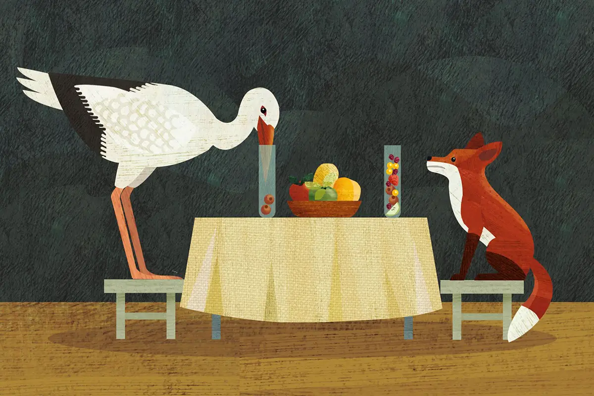 La cigüeña también se esmeró en preparar una comida exquisita. La zorra llegó puntual y se le hizo agua la boca al sentir los tentadores olores que venían del comedor. Pero cuando se sentaron a la mesa, la zorra se dio cuenta de que todo estaba servido en frascos de largo y fino cuello, donde solo cabía el pico de una cigüeña, y no el hocico de una zorra.