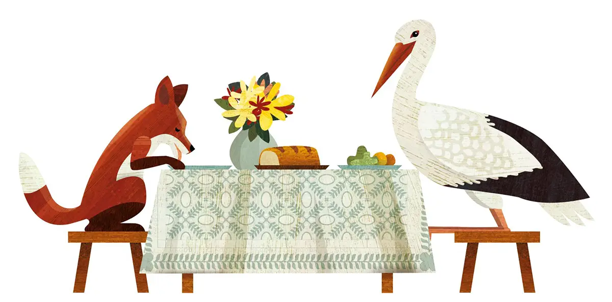 Cuando llegó la cigüeña, sintió unos deliciosos aromas que le abrieron el apetito. Pero cuando se sentaron a la mesa, se dio cuenta de que la zorra había puesto todos los manjares en platos grandes y muy planos, y ella no podía comer nada con su pico largo y fino. Sin embargo, no dijo nada.