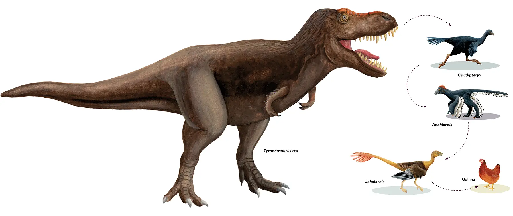 Las aves evolucionaron a partir de los dinosaurios en un proceso que ha tardado millones de años. Esto fue posible gracias a continuas adaptaciones y cambios en los que, generación tras generación, fueron disminuyendo significativamente su tamaño, modificando sus estructuras corporales y adquiriendo más y mejores plumas. El gigantesco y feroz Tyrannosaurus rex en realidad no desapareció del todo: hoy tenemos a las gallinas, sus descendientes. El hallazgo de diferentes fósiles nos muestra este camino de cambios.