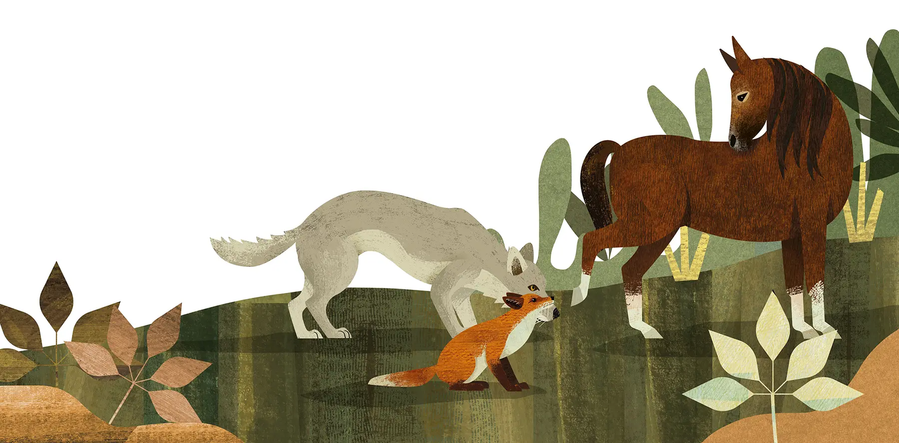 Érase una vez una zorra y un lobo que nunca habían visto a un caballo. De pronto, en el camino, se encontraron con uno muy grande y los dos se miraron con ojos de “por fin, el almuerzo”.