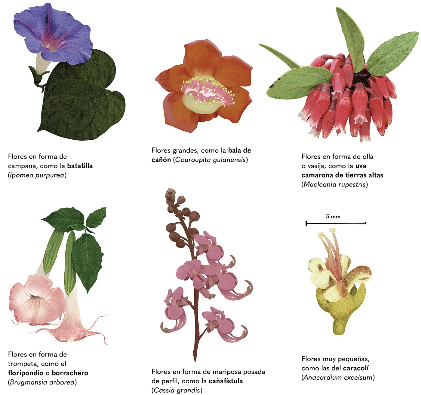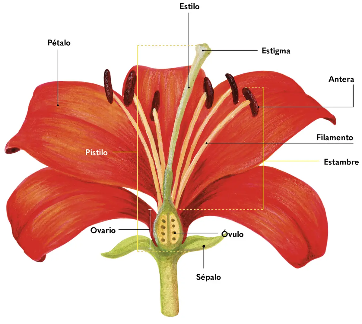 Las flores son la parte más vistosa de las plantas y, aunque son bastante diversas, la mayoría conserva una estructura similar. Los sépalos forman la parte más externa de la flor y protegen las demás partes florales. Luego están los pétalos, que suelen ser las estructuras más llamativas. Más al interior se encuentran los estambres y el pistilo. Los estambres son la parte masculina, y están compuestos por el filamento y las anteras, donde se producen los granos de polen. Por su parte, el pistilo corresponde a la parte femenina de la flor y está compuesto por el estigma, que es donde llegan los granos de polen, el estilo, que es el conducto por donde estos bajan, y el ovario que contiene los óvulos, los cuales eventualmente se convertirán en frutos cuando el polen los fecunde.