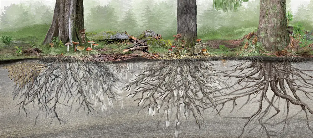 Las micorrizas ayudan a las plantas a comunicarse entre sí. Estas crean una compleja red de raíces, hongos y bacterias que conecta a las plantas y les permite expandir el área de la que pueden obtener nutrientes. Los hongos los extraen del suelo, y se los dejan disponibles, y, a cambio, reciben sustancias energéticas ricas en carbono de las raíces de las plantas. Esta relación simbiótica les permite a estas emitir advertencias sobre insectos atacantes, sequías y enfermedades.