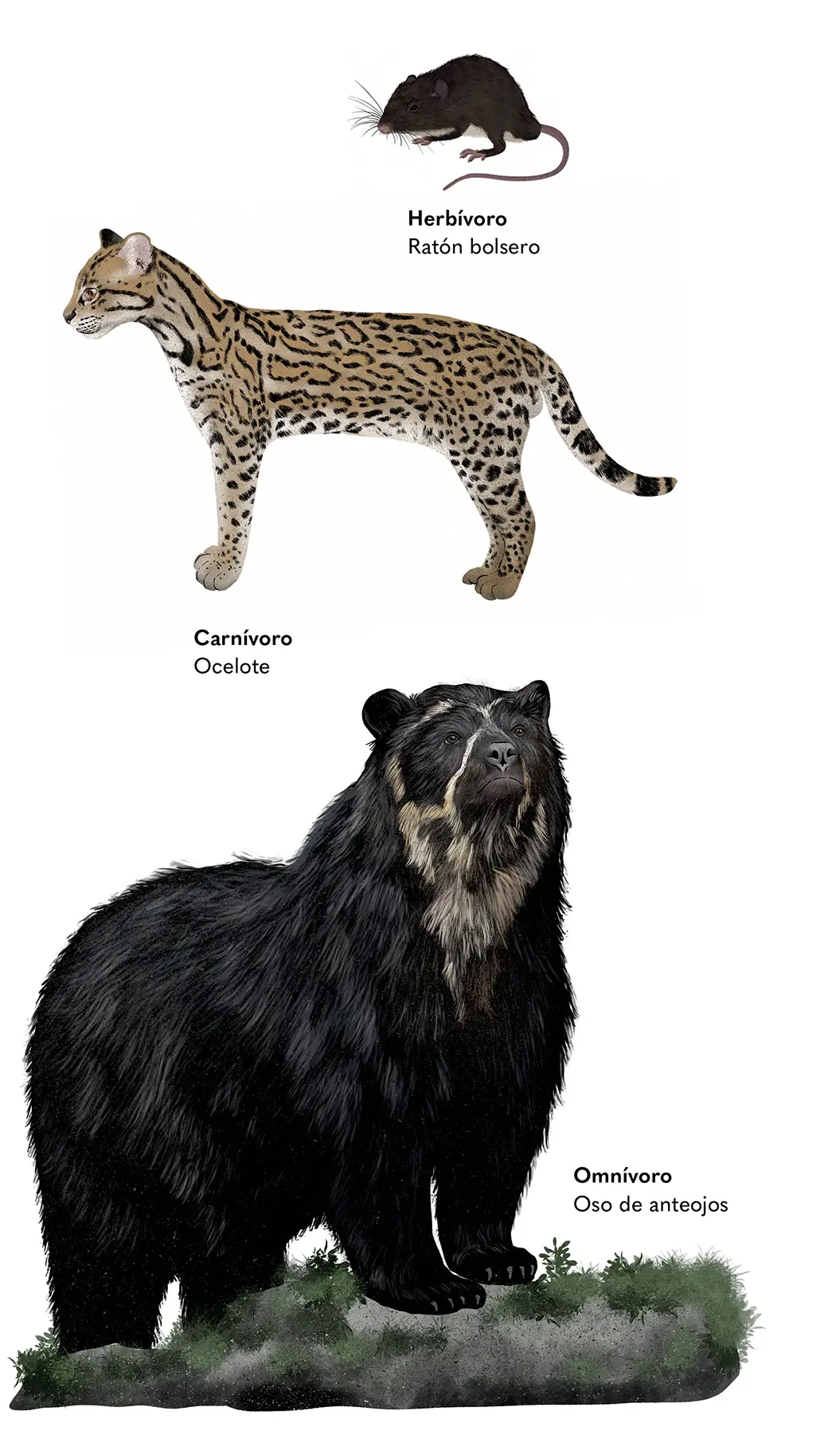 En el gran tejido de relaciones naturales, cada especie tiene su lugar y función. Todo comienza con las plantas, que producen flores, hojas, frutas, raíces y semillas. Roedores, osos y zarigüeyas las consumen y dispersan semillas a través de sus excrementos; los murciélagos, por su parte, ayudan a polinizar, dispersar semillas y a controlar poblaciones de insectos; los venados y otros herbívoros, como los chigüiros y las dantas, se alimentan de diversas plantas y controlan su crecimiento. Pero, si hay demasiados herbívoros, podrían acabar con las plantas, y entonces entran en juego los carnívoros, como tigrillos, zorros y perros, que, al alimentarse de los herbívoros, ayudan a mantener el equilibrio de los ecosistemas. Por su parte, los omnívoros, como los mapaches, cumplen funciones mixtas: dispersan semillas, controlan el crecimiento de algunas plantas y regulan la propagación de otros animales.