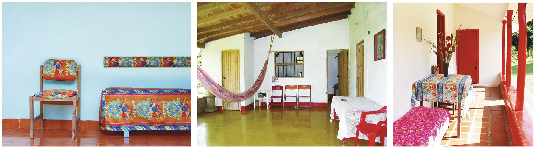 Una mesa y unas sillas crean un espacio de encuentro; una hamaca es un lugar para descansar, soñar y pensar; una estera y cojines invitan a escuchar música; unas mecedoras llaman a la conversación; y una banca invita a mirar y disfrutar el paisaje.