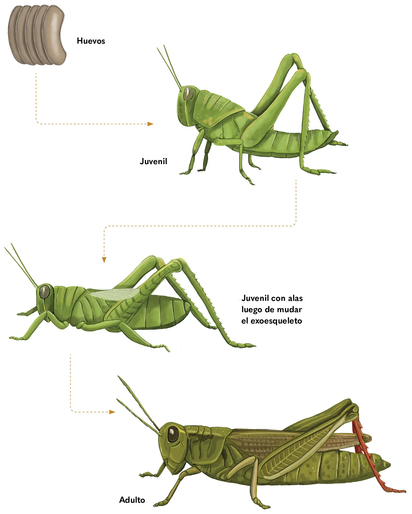En otras especies, como en los grillos, la forma de juveniles y adultos es muy similar. A medida que crecen, mudan su exoesqueleto y solo se observan transformaciones en las alas, ojos y otras partes del cuerpo.