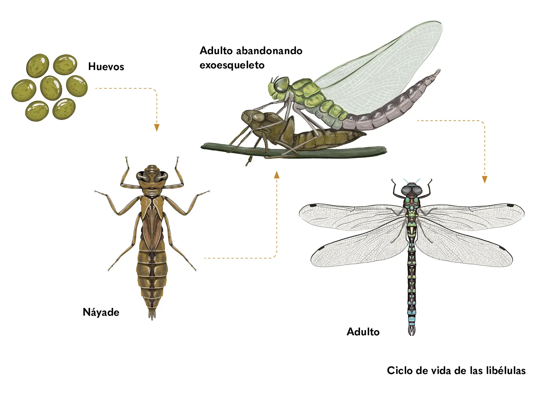 En especies como las libélulas hay cambios en la forma y en el lugar donde viven, ya que cuando son jóvenes viven en el agua y se les llama náyades.