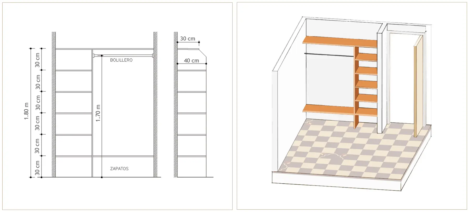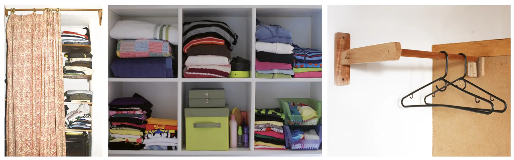 Se puede armar guardaderos de ropa con tubos para colgarla y entrepaños para ponerla doblada, y en lugar de puerta, por facilidad y economía, no conviene utilizar cortinas, que con sus colores adornan el cuarto.