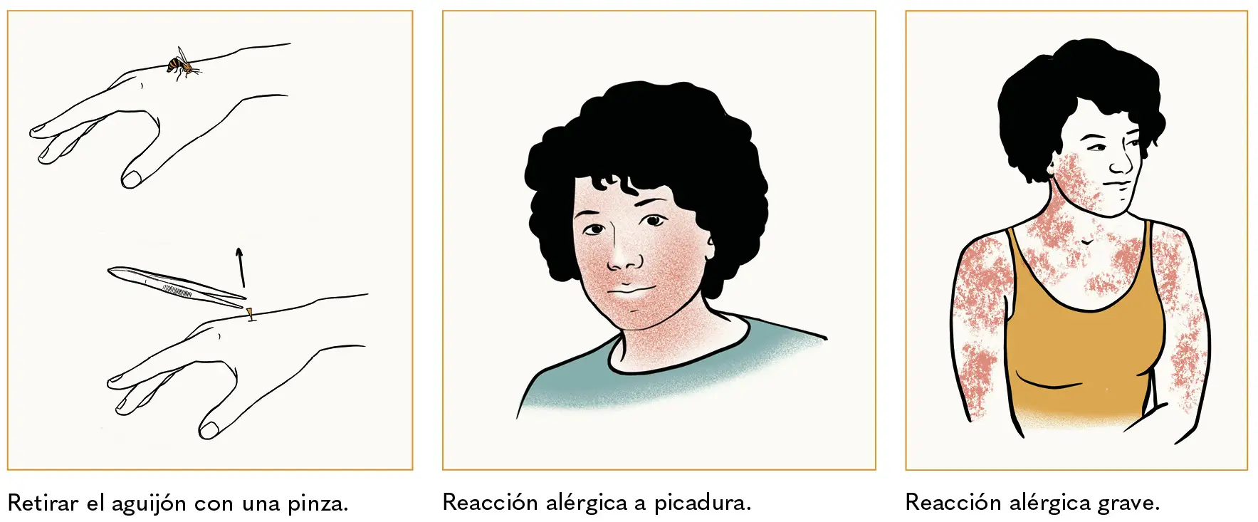 Si lo que lo picó fue una abeja o avispa y no hay una reacción alérgica grave, debemos retirar el aguijón con una pinza y aplicar compresas de agua fría y hielo sobre la lesión. Si por accidente uno de estos insectos pica en el interior de la boca, debemos hacer gárgaras de agua helada y chupar trozos de hielo, para evitar una obstrucción respiratoria, y debemos llevar el paciente a urgencias porque la hinchazón puede progresar con el tiempo y obstruir la vía aérea.