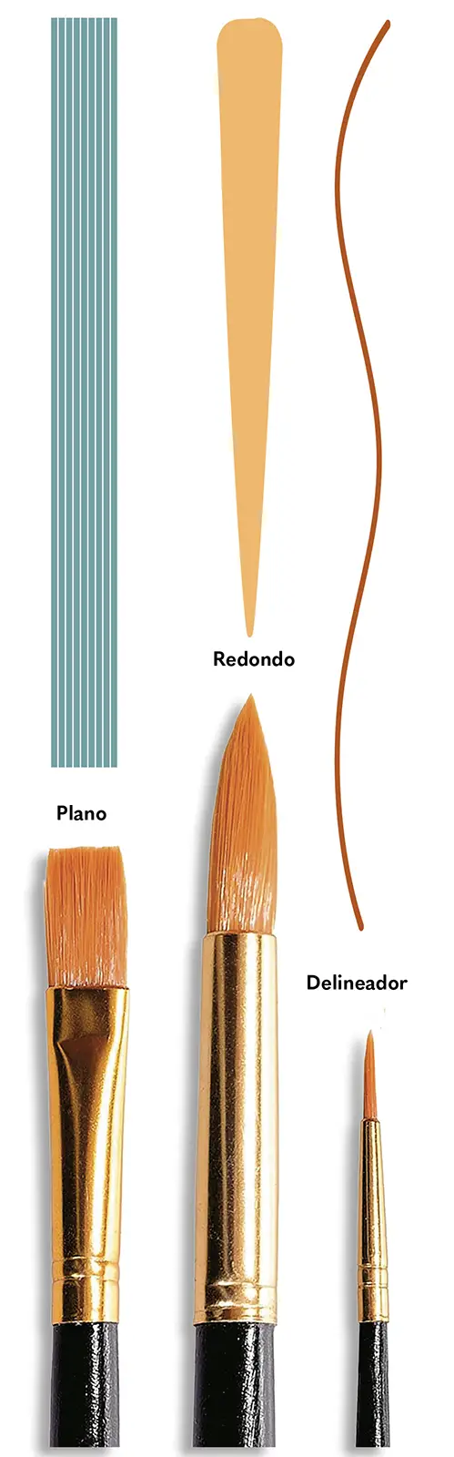 Hay diferentes formas de pinceles según las funciones que cumplen. En este libro utilizaremos principalmente pinceles planos (ideales para cubrir superficies de color) y pinceles redondos, casi siempre delineadores (perfectos para trazar líneas precisas y dibujar detalles).
