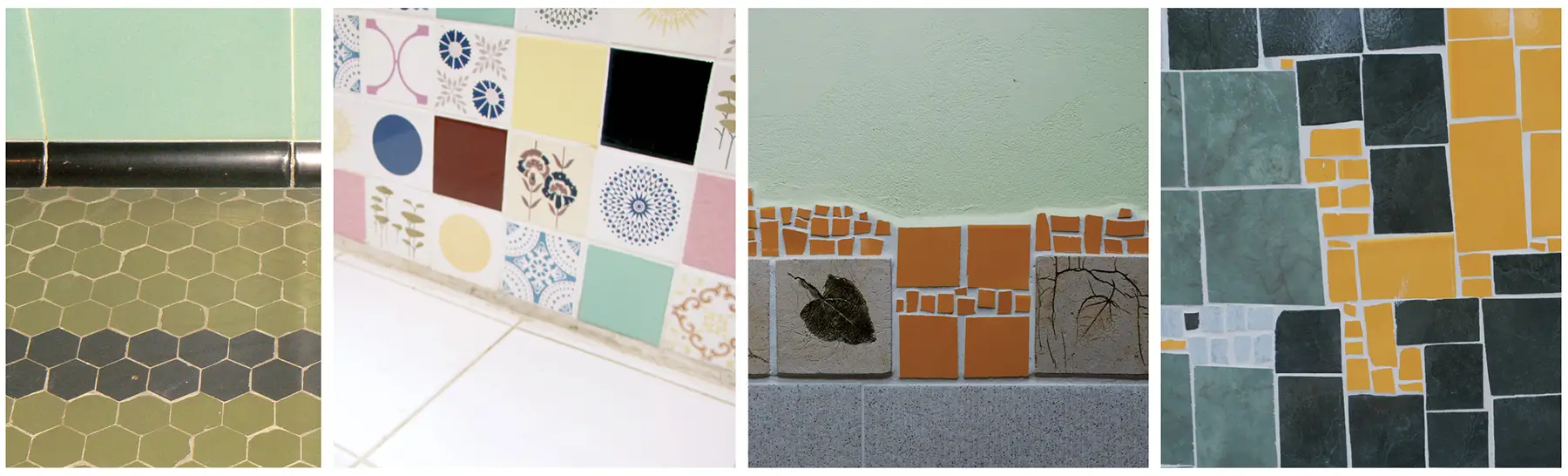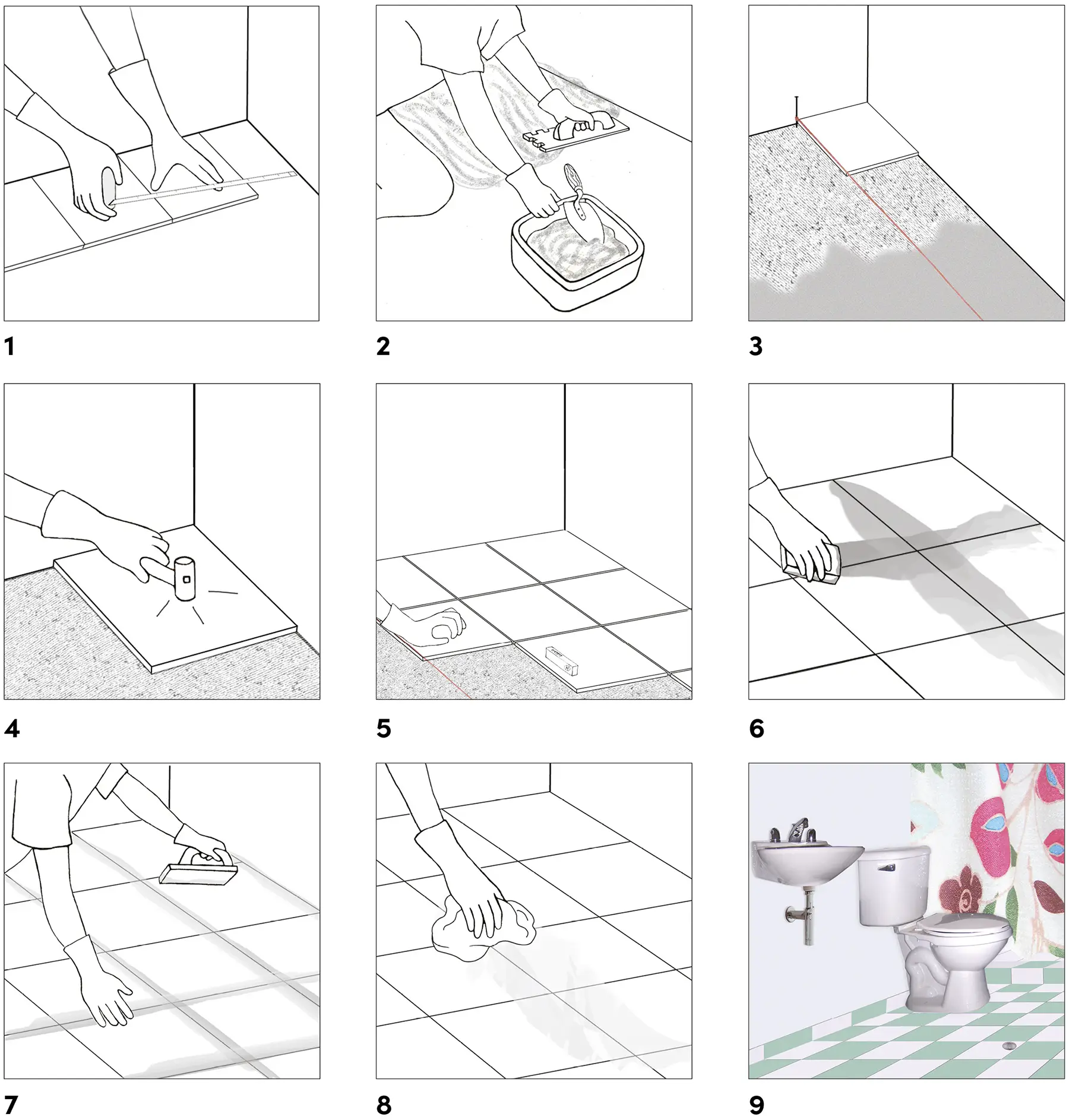 1. Ponga el enchape sobre un piso de cemento seco, limpio y nivelado. Antes de pegar, planee la repartición de las baldosas y prepare las piezas de ajuste.