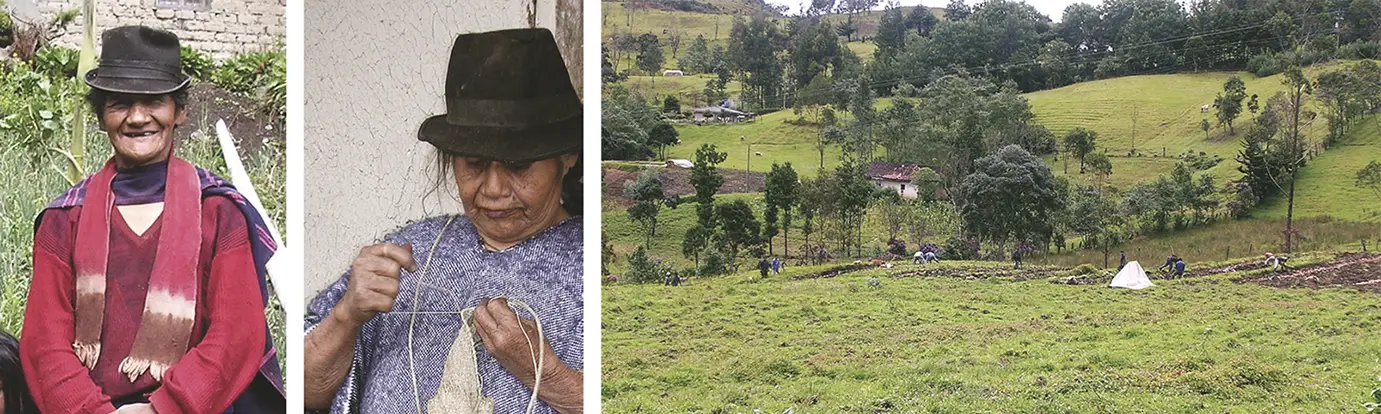 La mujer siempre va atrás; si tiene bebé, lo carga amarrado a la espalda con un chumbe –faja tejida en lana–; los brazos le quedan libres para poder trabajar. Ayudan al ‘picado’ de la tierra para ‘moldar’ –voltear la tierra–, haciendo las eras donde se riegan las semillas de papa o ulluco. Hoy usan también los surcos, en contra de la pendiente, para evitar la erosión; antes se hacían a favor de la pendiente. Si lo que tienen es ganado, la mujer ayuda al desenraizar la maleza, para que crezca el pasto, o aparta los terneros de sus mamás –un trabajo que se hace a la una de la tarde– para ordeñar al otro día a la madrugada.
