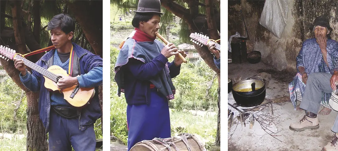 Aprendieron viendo y oyendo al papá y a los tatá señores. Hoy dicen con orgullo: “cultivamos la música y cultivamos la tierra”. Se levantan a las cinco o a las cuatro de la mañana, y van a pie, por entre caminos rodeados de montañas, a trabajar en un pedazo de tierra, “lejísimos”, en el páramo: cultivan papa y cebolla. Por la tarde, se reúnen, con toda la familia, alrededor del fogón que todo el día está prendido. Sentados en pangus pequeños bancos tallados en un solo bloque de madera- tocan sus instrumentos y a veces componen, mientras las mujeres tejen o hilan y los cuyes corretean por un piso de tierra.